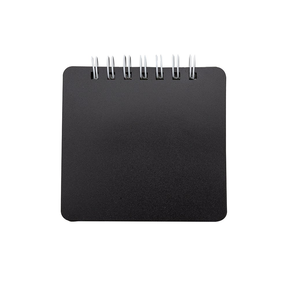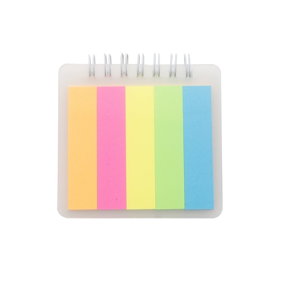 Bloco de anotações plástico com autoadesivos e wire-o, contém cinco blocos autoadesivos coloridos com aproximadamente 25 folhas cada.