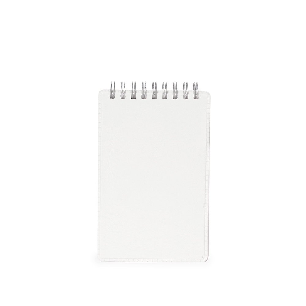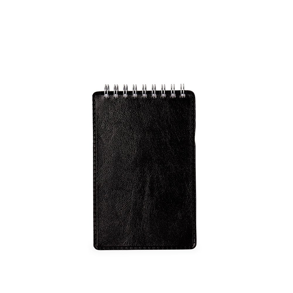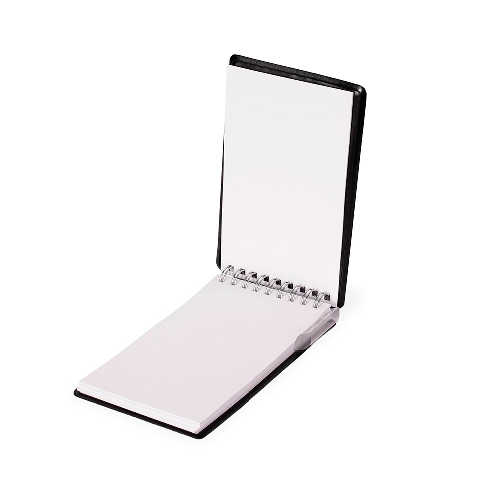 Bloco de anotações com capa em couro sintético, porta-canetas em plástico e encadernação Wire-O. Contém aproximadamente 100 folhas brancas sem pauta.
