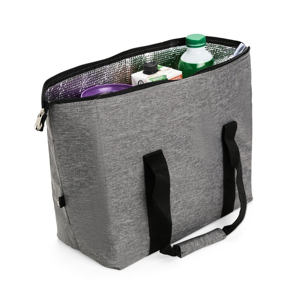 Bolsa térmica confeccionada em Oxford resistente à água, fechamento em zíper e capacidade de até 25 litros. Possui revestimento térmico interno em folha de alumínio, botões laterais de metal para junção, bolso externo e alças de mão em nylon com suporte de união por velcro.