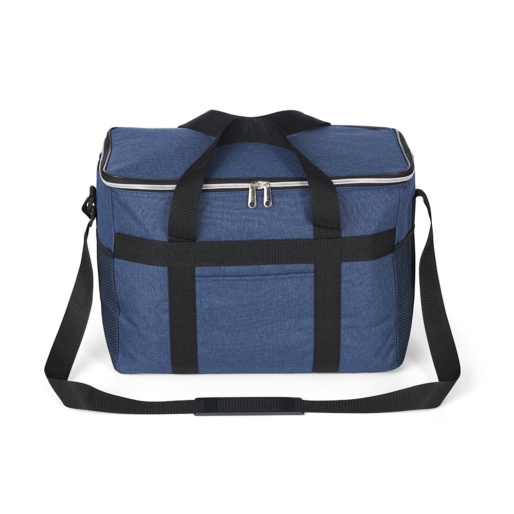 Bolsa térmica de poliéster oxford 300D de 31 litros com bolso frontal e bolsos laterais em malha.