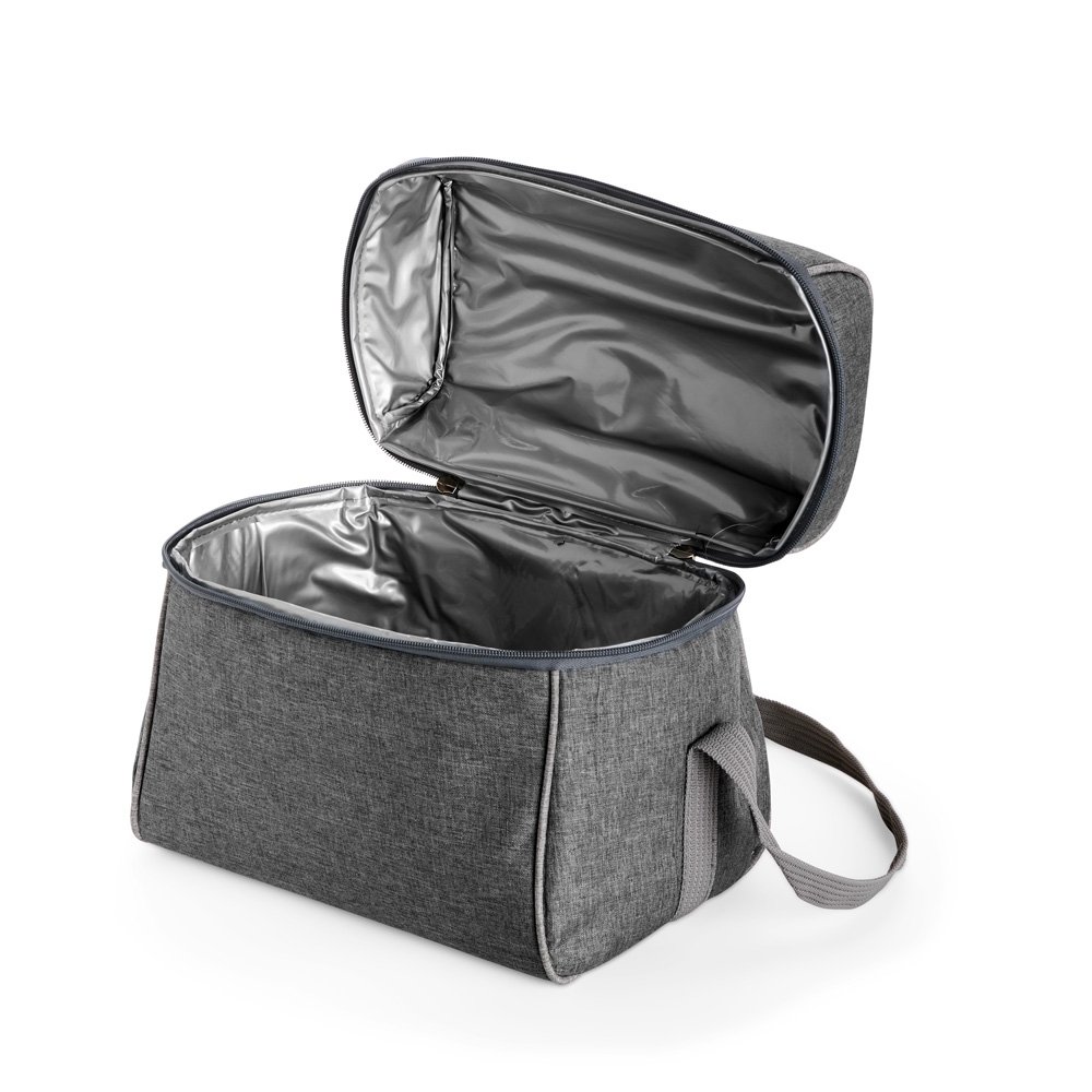 Bolsa térmica confeccionada em poliéster resistente à água, com capacidade máxima de 14 litros e fechamento em zíper. Possui revestimento térmico interno em PVC laminado prata verniz, que ajuda a conservar a temperatura de alimentos e bebidas por mais tempo. Além disso, conta com uma alça fixa na tampa e outra transversal ajustável.
