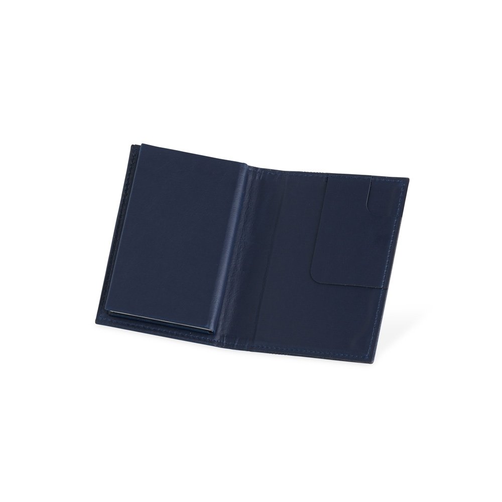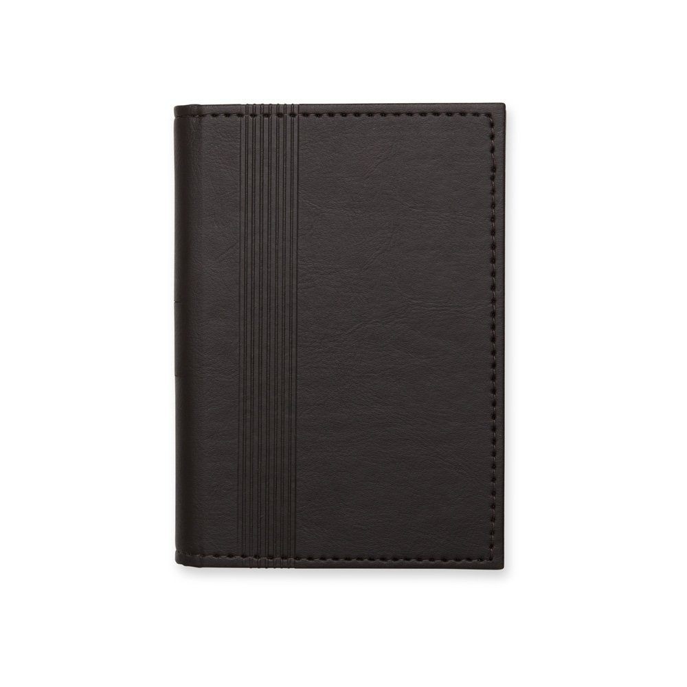 Caderneta em couro sintético com porta caneta e compartimento para arquivar folhas. Possui aproximadamente 80 folhas marfim sem pauta.