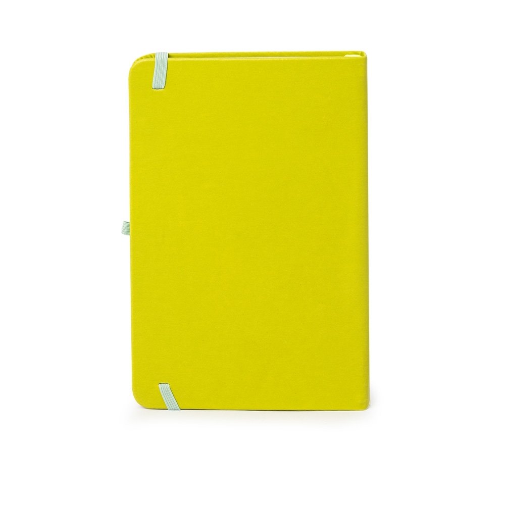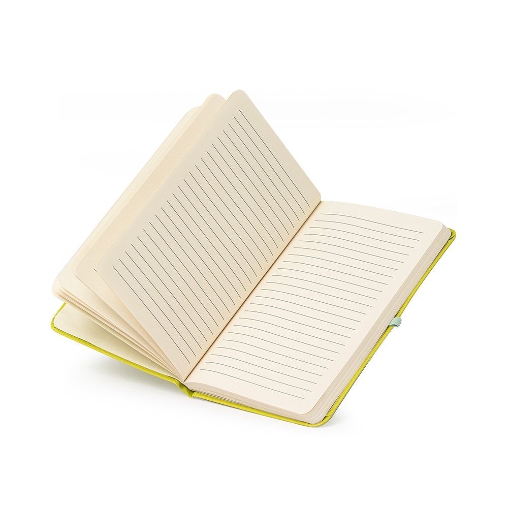 Caderneta em couro sintético com porta caneta, marcador de página em cetim e fita elástica para lacre. Contém aproximadamente 80 folhas pardas com pauta.