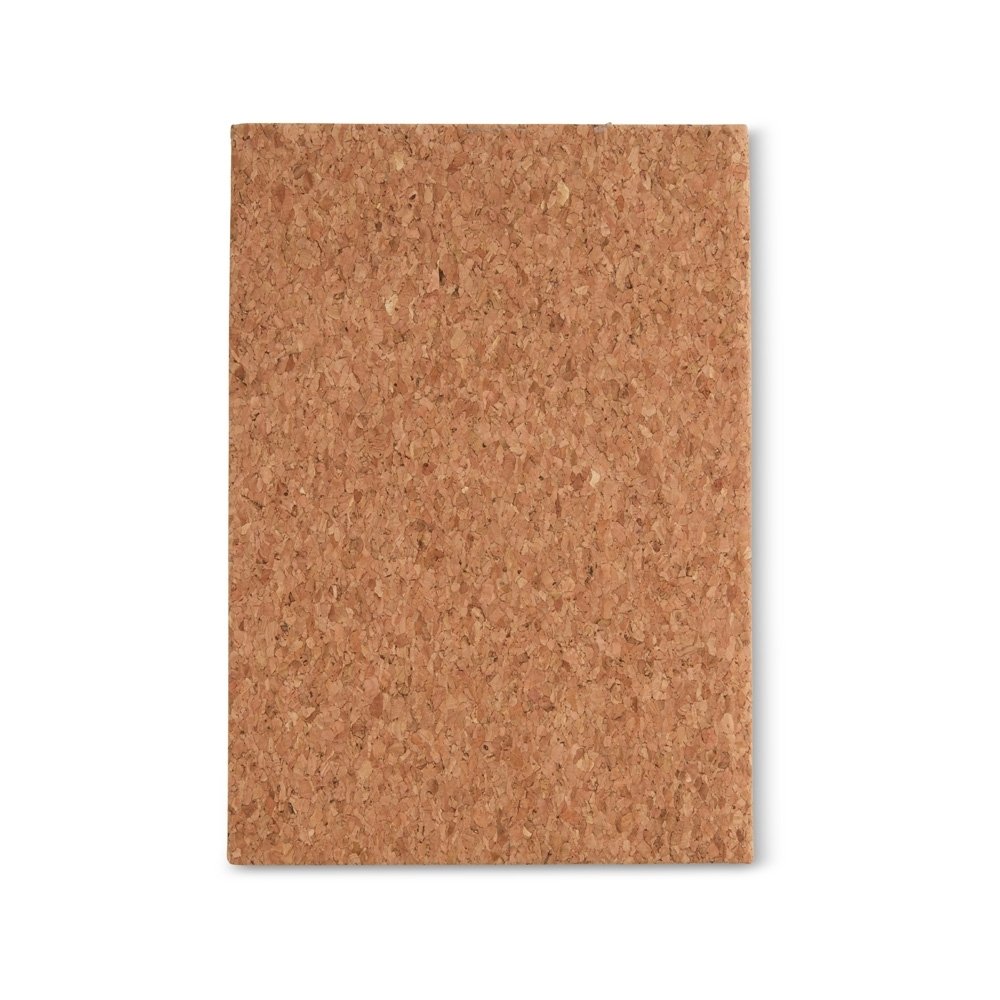 Caderneta de bambu com detalhe em cortiça. Possui aproximadamente 96 folhas brancas pautadas e suporte para caneta.