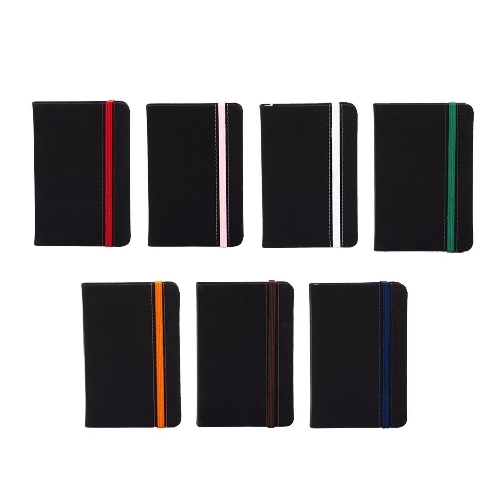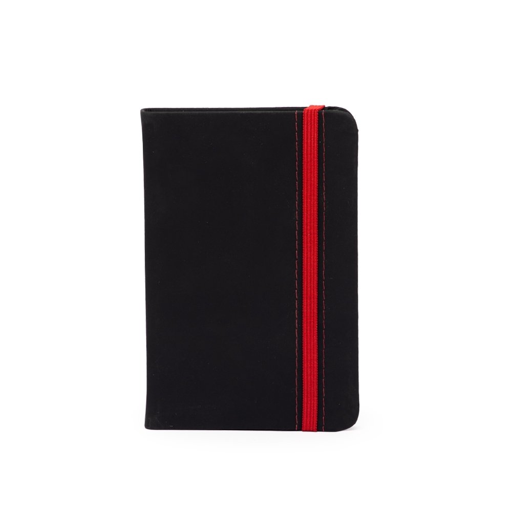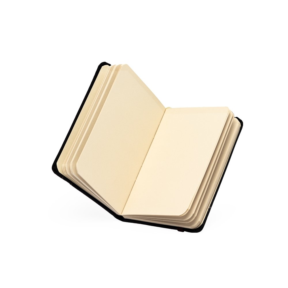 Caderneta emborrachada com marcador de página em cetim e fita elástica de nylon para fechar. Contém aproximadamente 78 folhas marfim sem pautas.