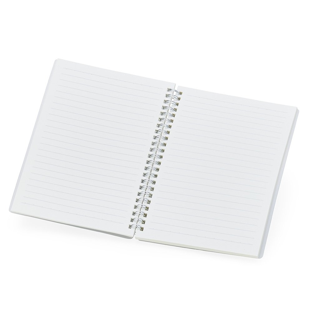 Caderno A5 com capa plástica e elástico para lacre, contém aproximadamente 80 folhas marfim com pauta.