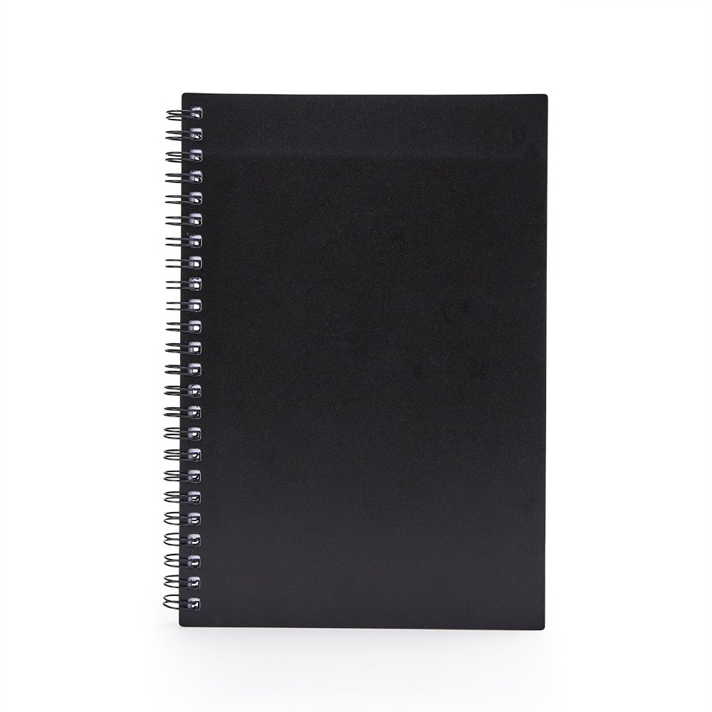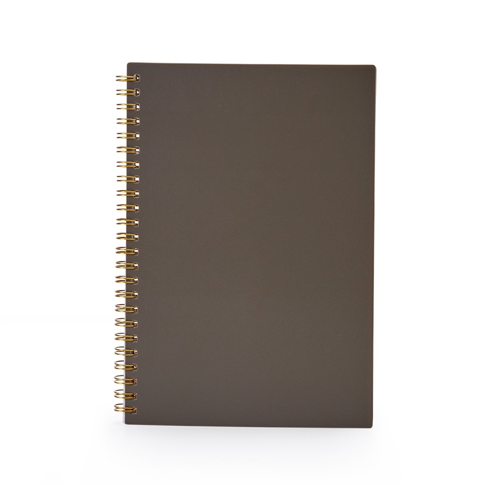 Caderno A5 plástico com wire-o metálico. Capa em PP, contém aproximadamente 80 folhas brancas com pauta.