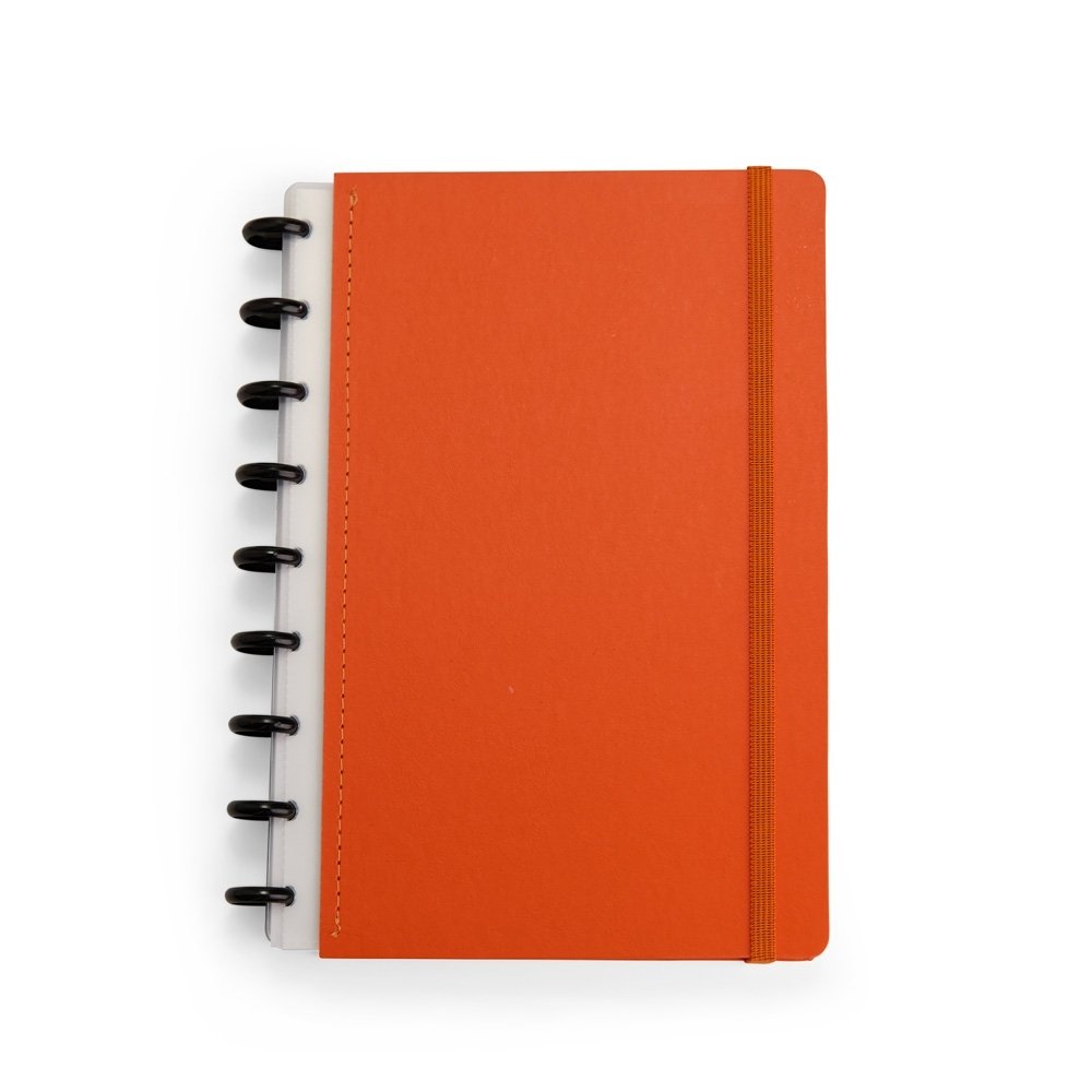 Caderno de capa dura, fechamento em elástico e encadernação com discos plásticos reposicionáveis, que permitem retirar e adicionar folhas compatíveis. Apresenta página para dados pessoais, calendários de 2025 e 2026, folha com instruções de uso e bolso plástico. Possui cerca de 80 folhas brancas pautadas.