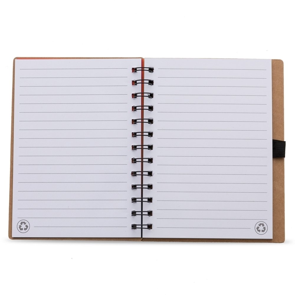 Caderno ecológico com símbolo reciclado na capa, acompanha folhas coloridas estilo folhas de guarda nas cores: vermelho, amarelo, laranja, azul, verde e preto, possibilitando selecionar a cor desejada como fundo do logo reciclado. Possui aproximadamente 70 folhas brancas pautadas com logo reciclado na lateral inferior das folhas, possui também elástico suporte para caneta(não acompanha caneta).