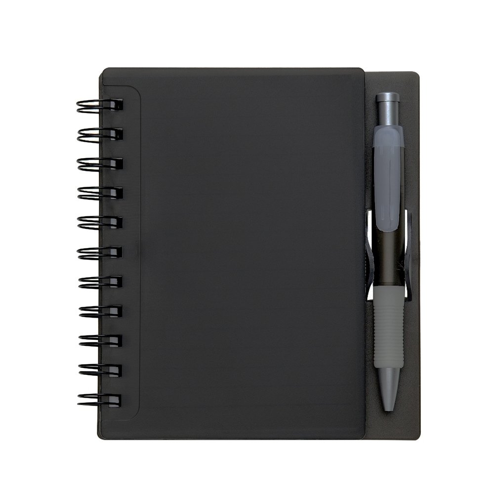 Caderno plástica wire-o com caneta e suporte para encaixe. Caneta plástica com detalhe emborrachado, carga esferográfica na cor azul e acionamento por clique.