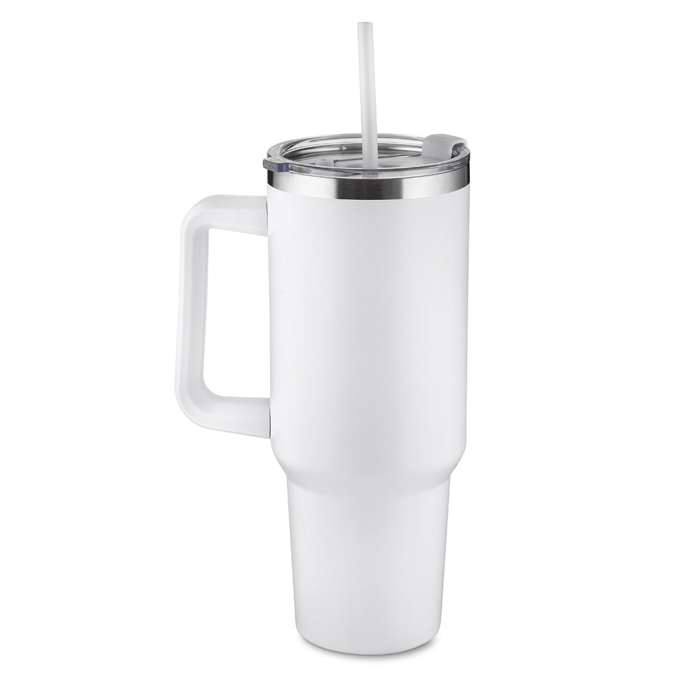 Caneca térmica em inox com alça reforçada, pintura eletrostática e capacidade para até 1,3 litro. Apresenta estrutura de parede dupla e vedação a vácuo, permitindo conservar a temperatura de líquidos por mais tempo. Dispõe de tampa em plástico com protetor para o bocal e acesso central para canudo. Acompanha canudo em plástico PP.