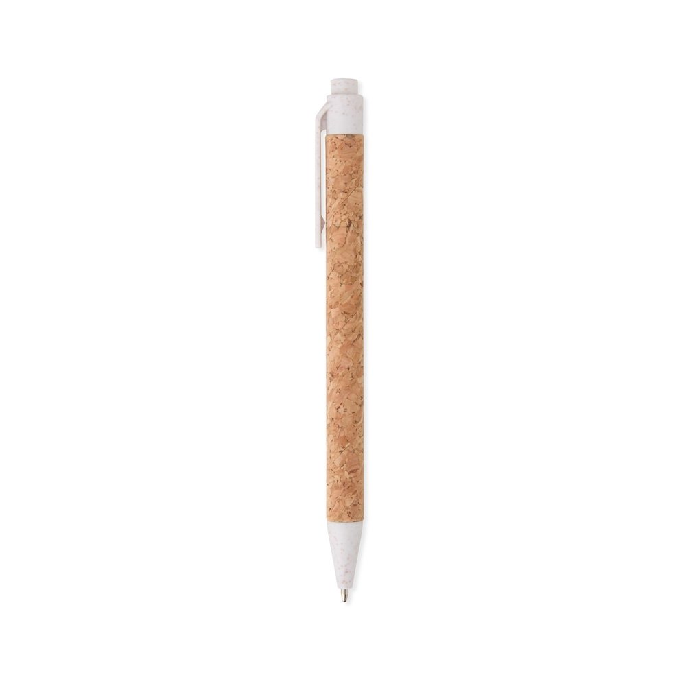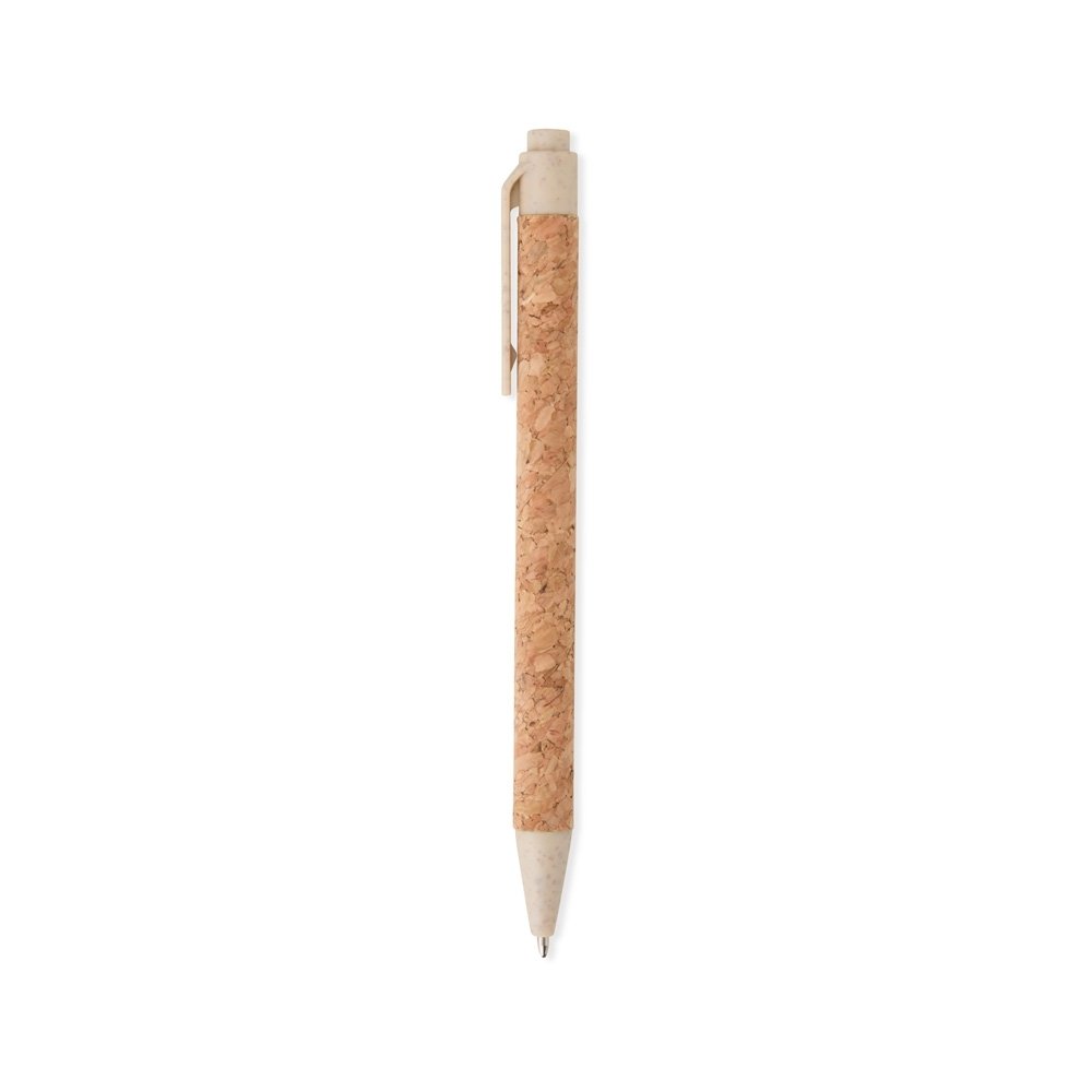 Caneta de cortiça com detalhes em palha de trigo, carga esferográfica azul 1.0mm e acionamento por clique.