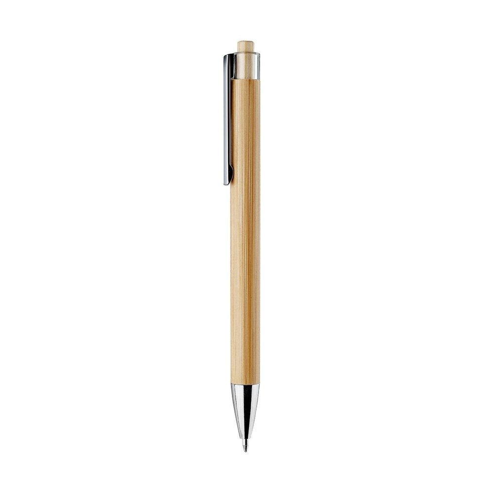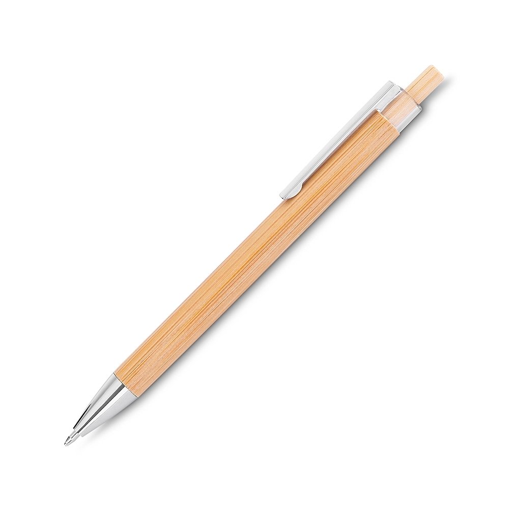 Caneta feita em bambu com acionamento por clique, ponteira e clip metálicos com detalhe em plástico. Possui carga esferográfica azul de 1.0mm.