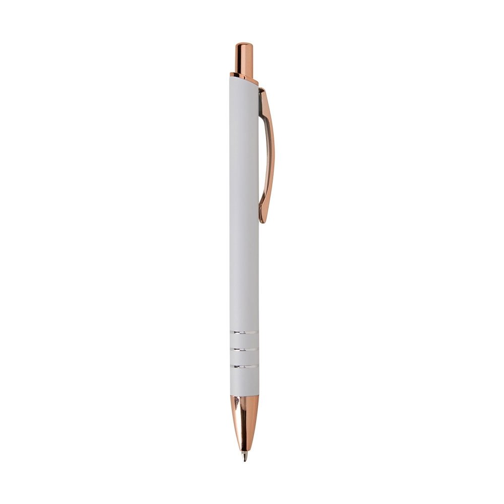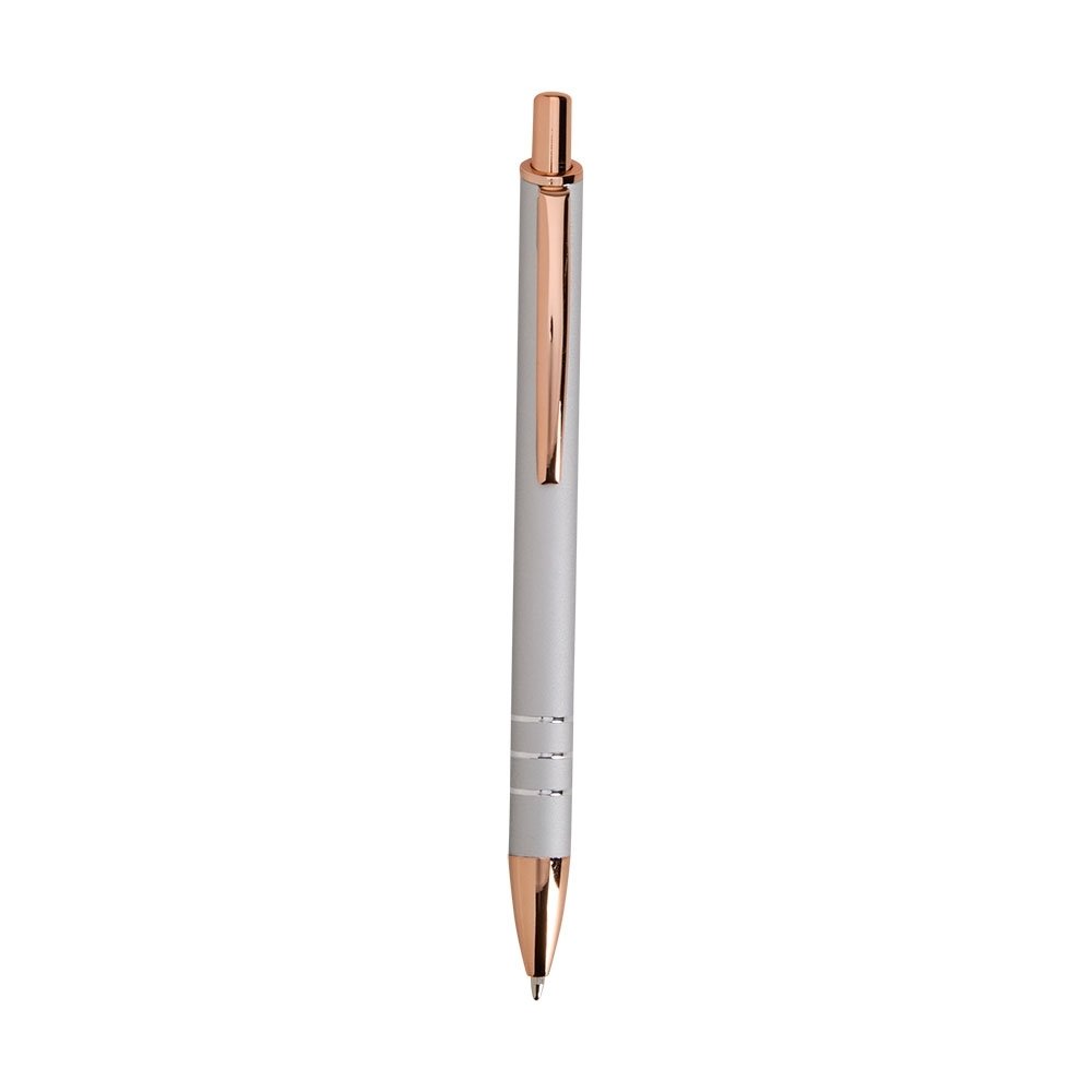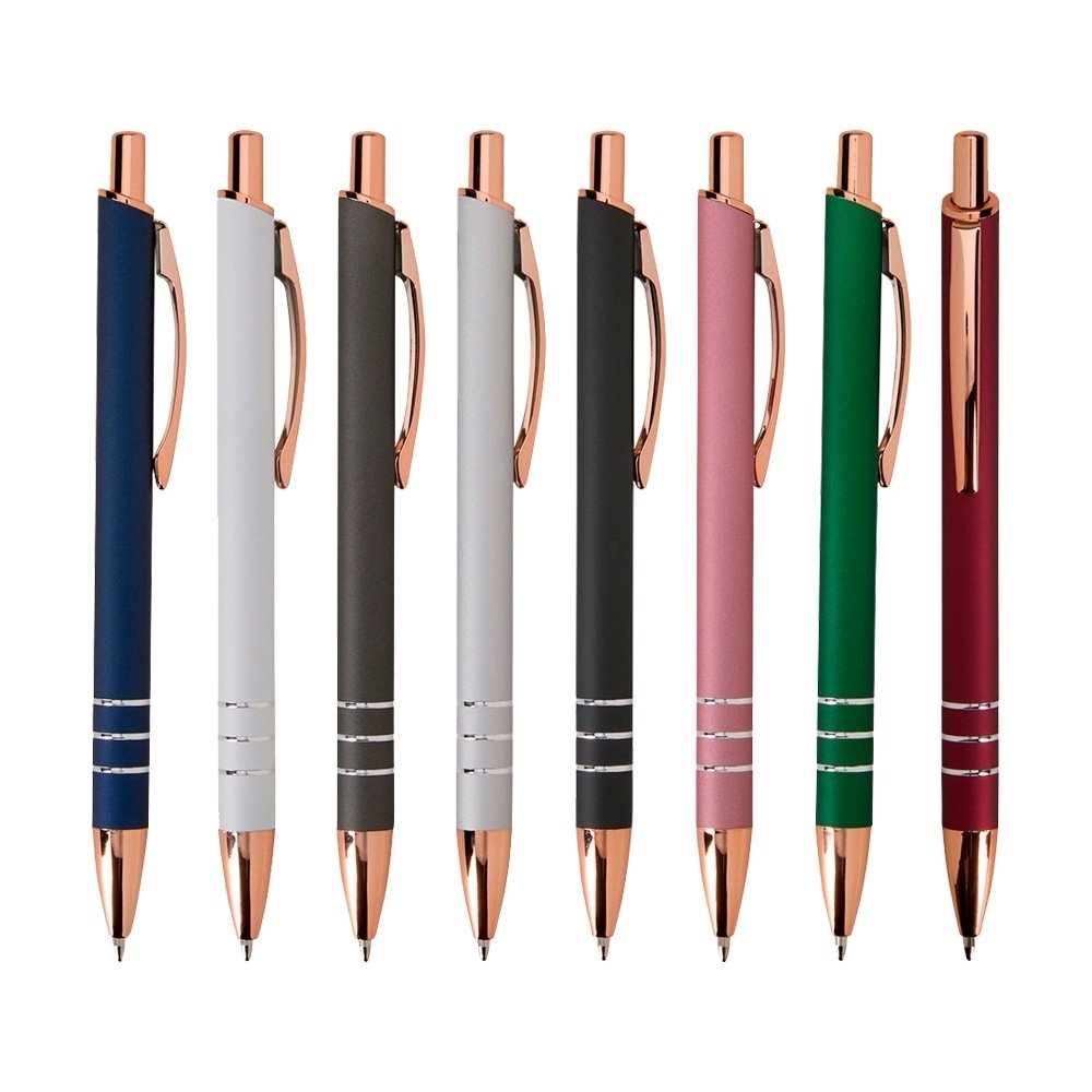 Caneta metálica com acionamento por clique e carga esferográfica azul de 1.0mm, uma combinação que oferece pegada leve para uma escrita mais precisa.