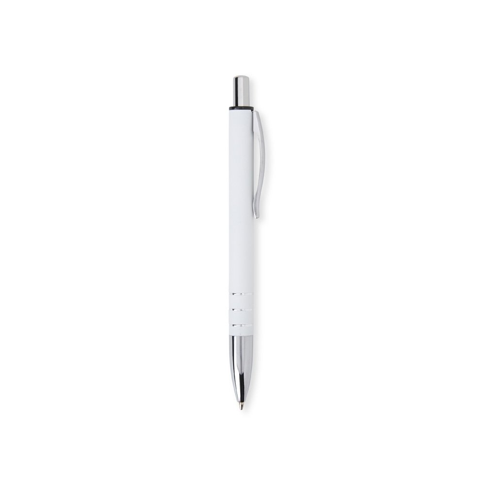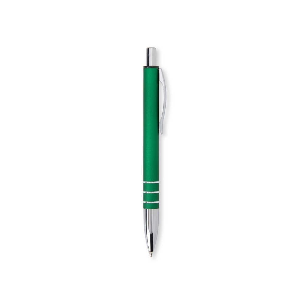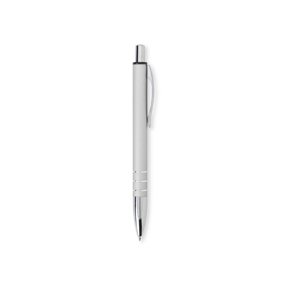 Caneta metálica com acabamento fosco, clipe metálico e ponteira plástica. Carga esferográfica azul 1.0mm e acionamento por clique.