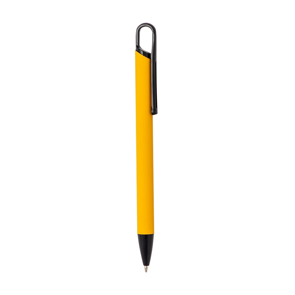 Caneta metálica com acabamento similar à borracha, clipe e ponteira plásticas, carga esferográfica azul 1.0mm e acionamento por clique.