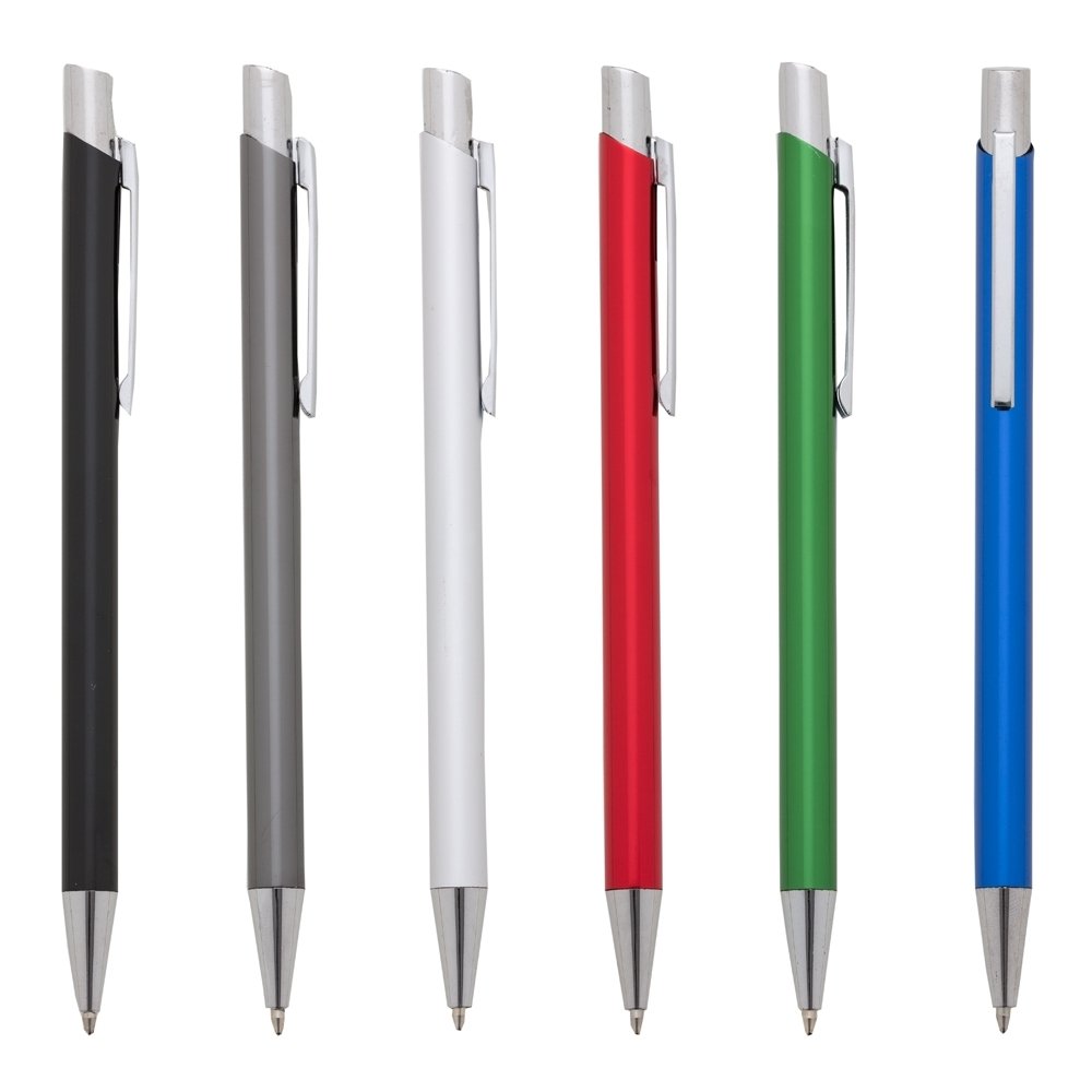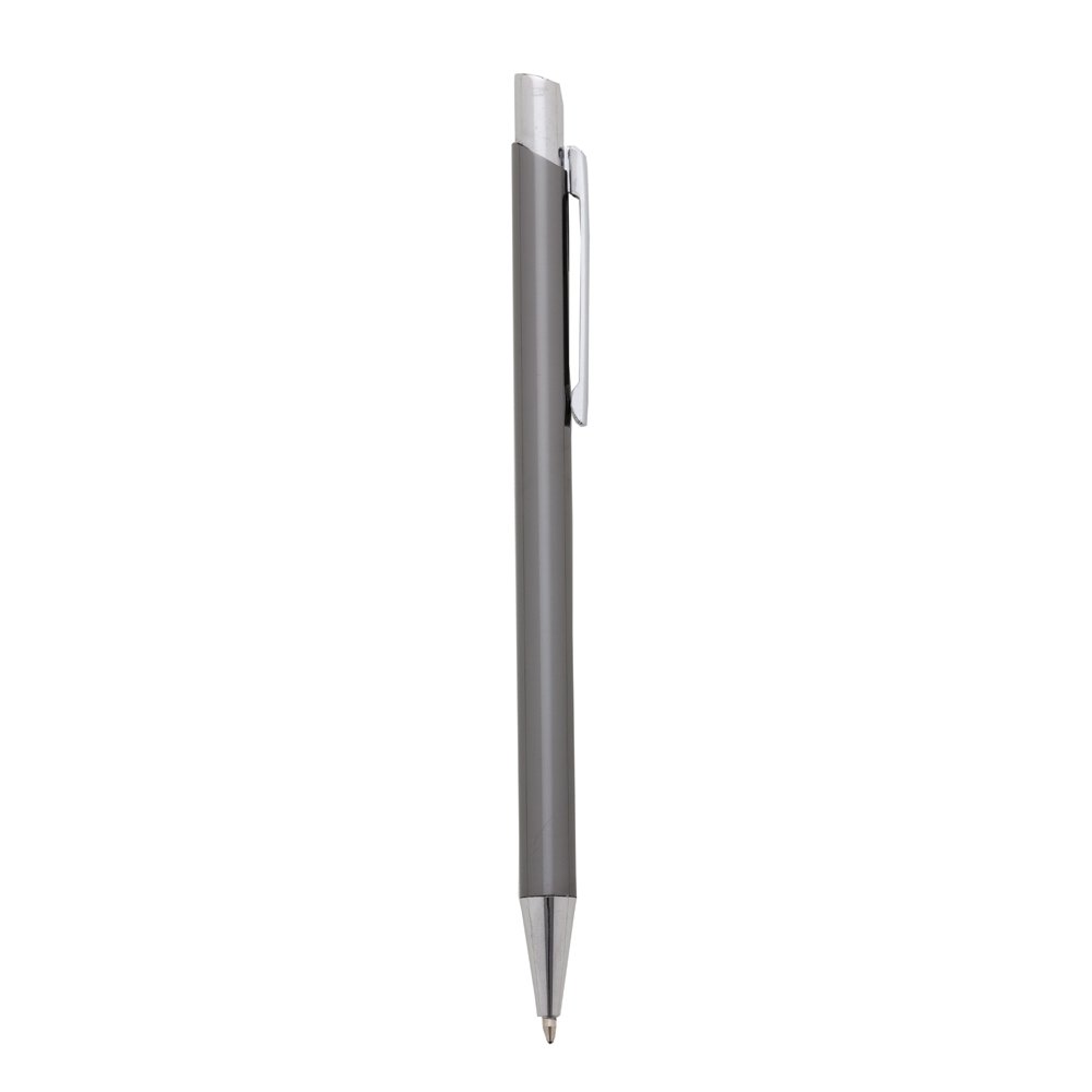 Caneta metálica com carga esferográfica azul 1.0 mm e acionamento por clique.