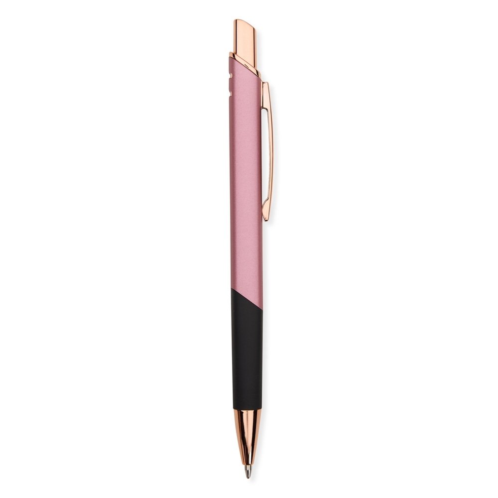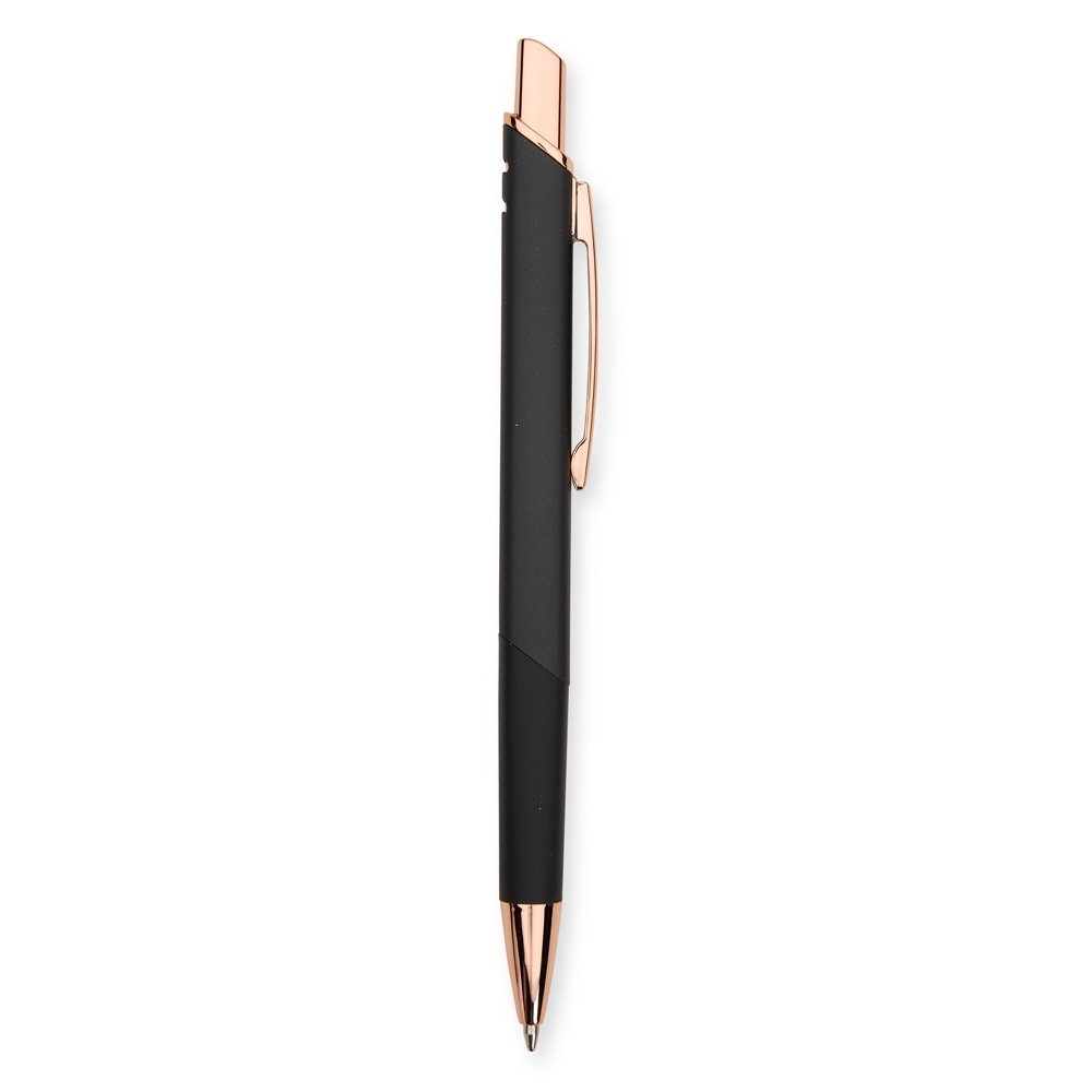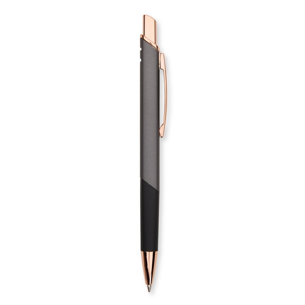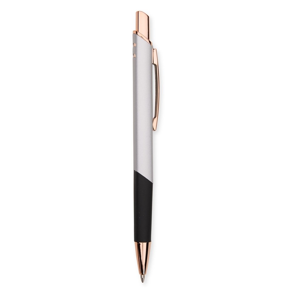 Caneta feita inteiramente em metal com acionamento por clique e carga esferográfica azul de 1,0mm.