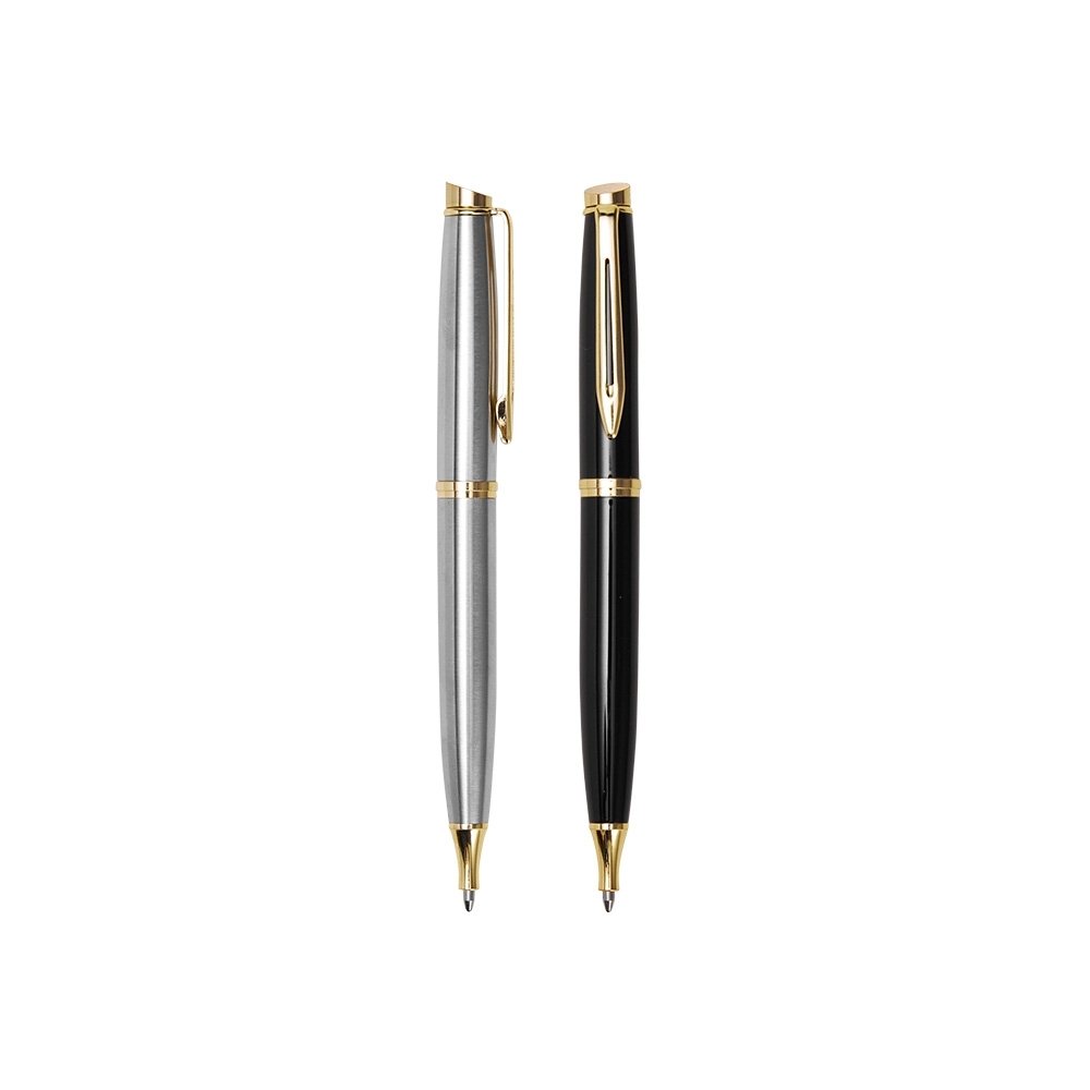 Caneta metálica com carga esferográfica azul 1mm e acionamento por rotação.