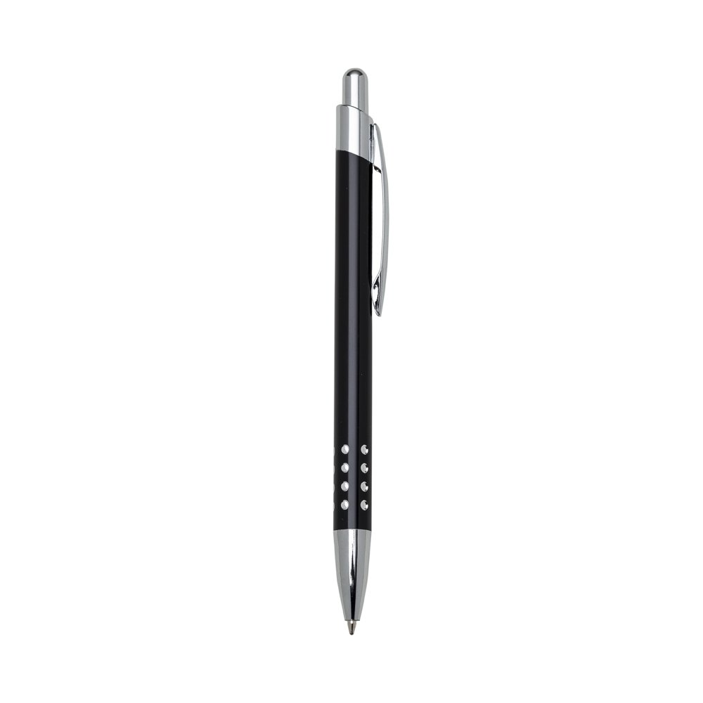 Caneta metálica com detalhes em cristal, carga esferográfica azul e acionamento por clique.