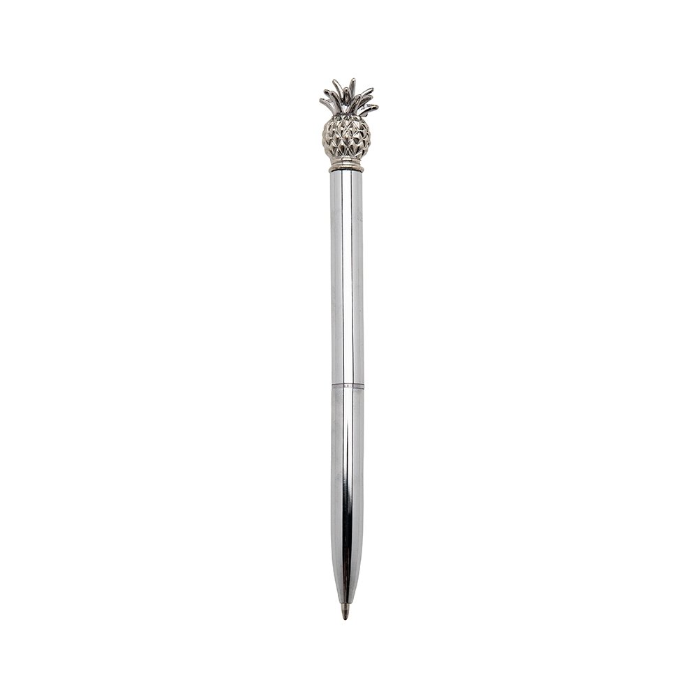 Caneta metálica com carga esferográfica azul e acionamento por rotação.