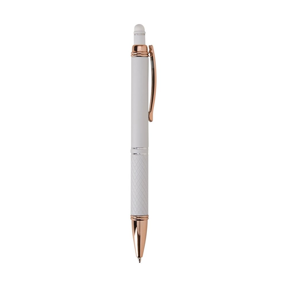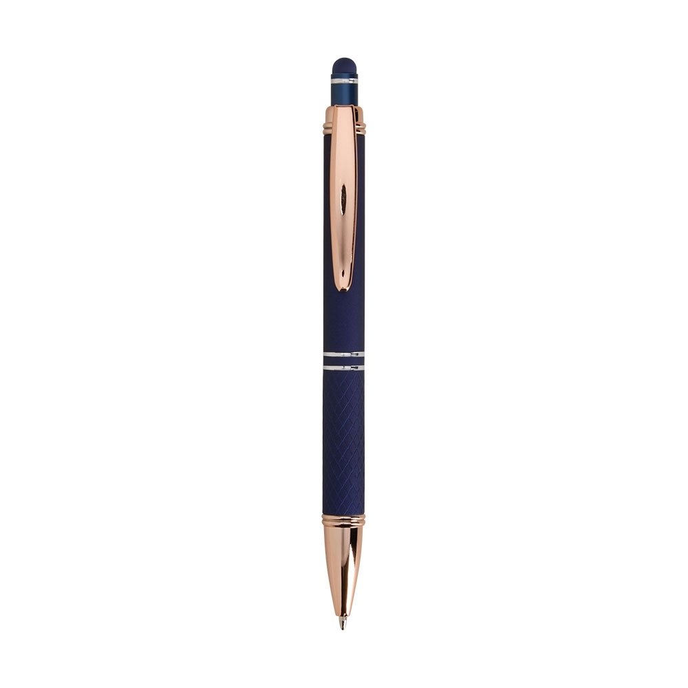 Caneta metálica com detalhes texturizados próximos à ponta, carga esferográfica azul de 1.0mm e acionamento por clique com acabamento emborrachado, ideal para usar como uma caneta touch para interação com dispositivos de tela sensível ao toque.