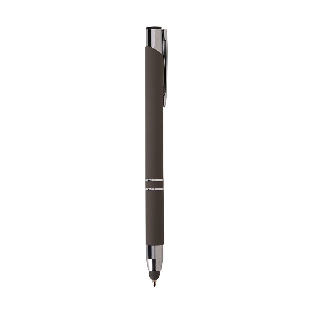 Caneta esferográfica com carga azul de 1.0mm e acionamento por clique. De construção metálica, também possui ponteira emborrachada que permite seu uso como uma caneta touch para interação com dispositivos de tela sensível ao toque.