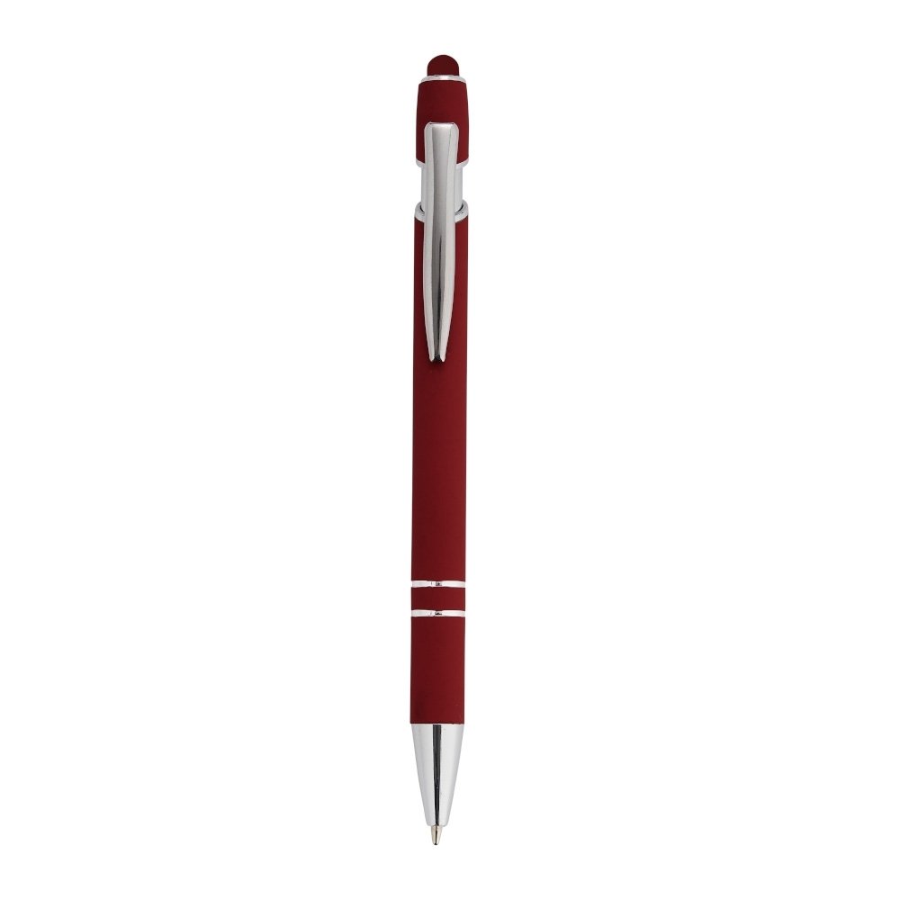 Caneta metálica touchscreen com acabamento similar à borracha, acionamento por clique e carga esferográfica azul 1.0mm.