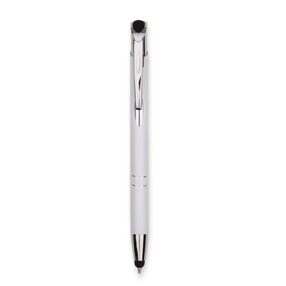 Caneta metálica com acionamento por clique texturizado e carga esferográfica azul de 1,0 mm. Possui ponta com revestimento emborrachado para uso em telas sensíveis ao toque.