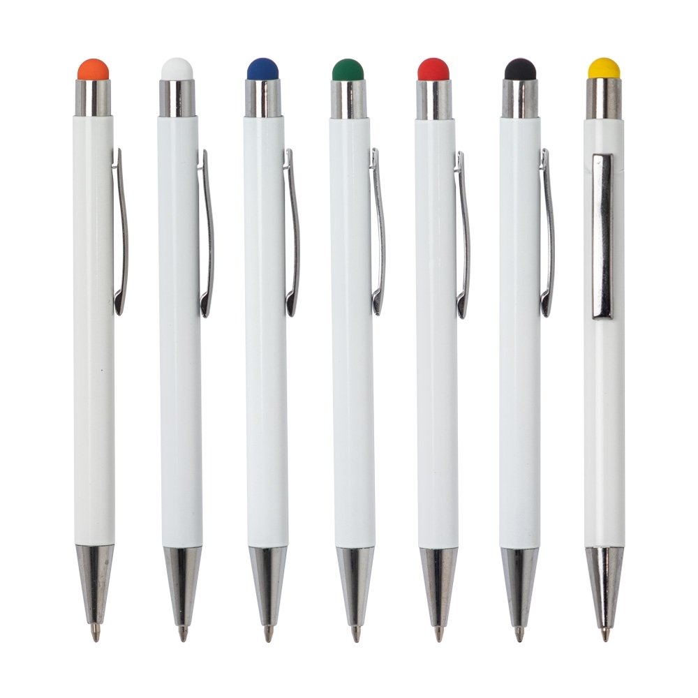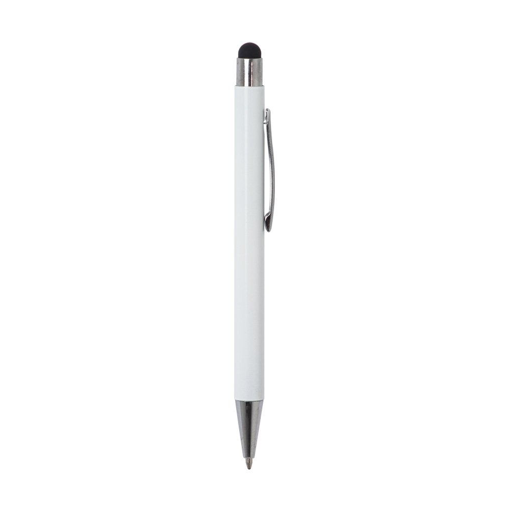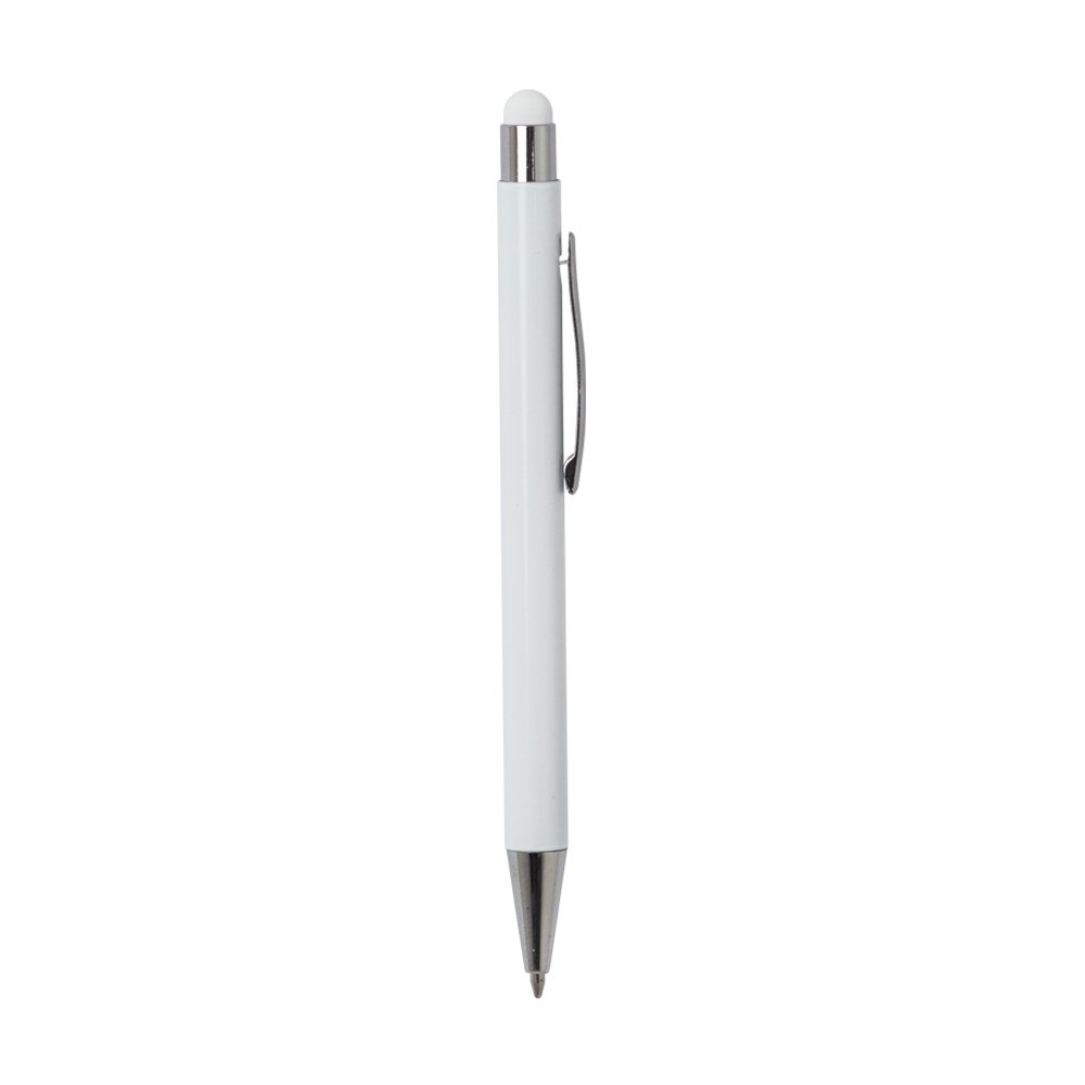 Caneta metálica com touch screen, carga esferográfica azul 1.0 mm e acionamento por clique.