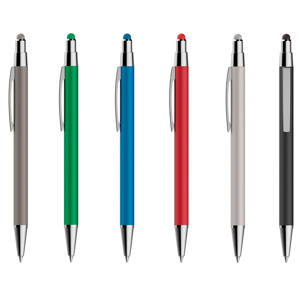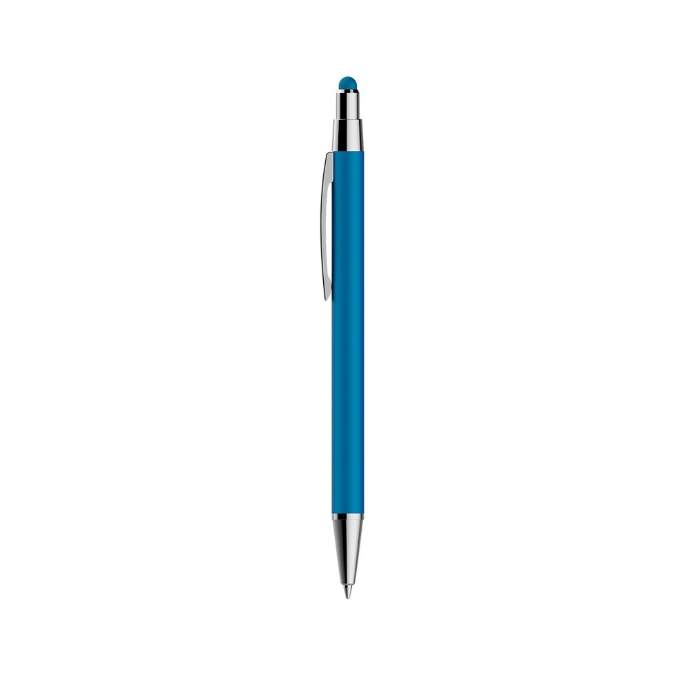 Caneta metálica com touch screen, carga esferográfica azul e acionamento por clique.