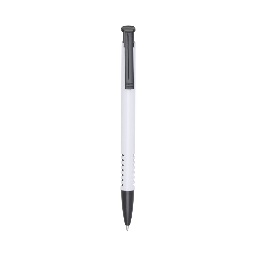 Caneta plástica com carga esferográfica azul 1.0 mm e acionamento por clique.