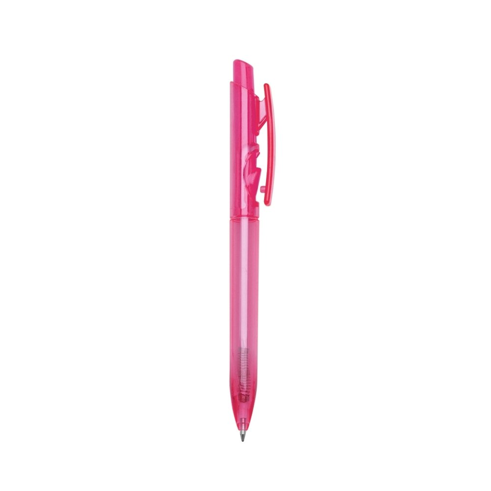 Caneta plástica com carga esferográfica azul e acionamento por clique.