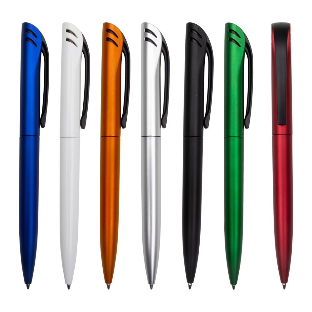 Caneta Plástica com acionamento por rotação e carga esferográfica azul 1.0mm.