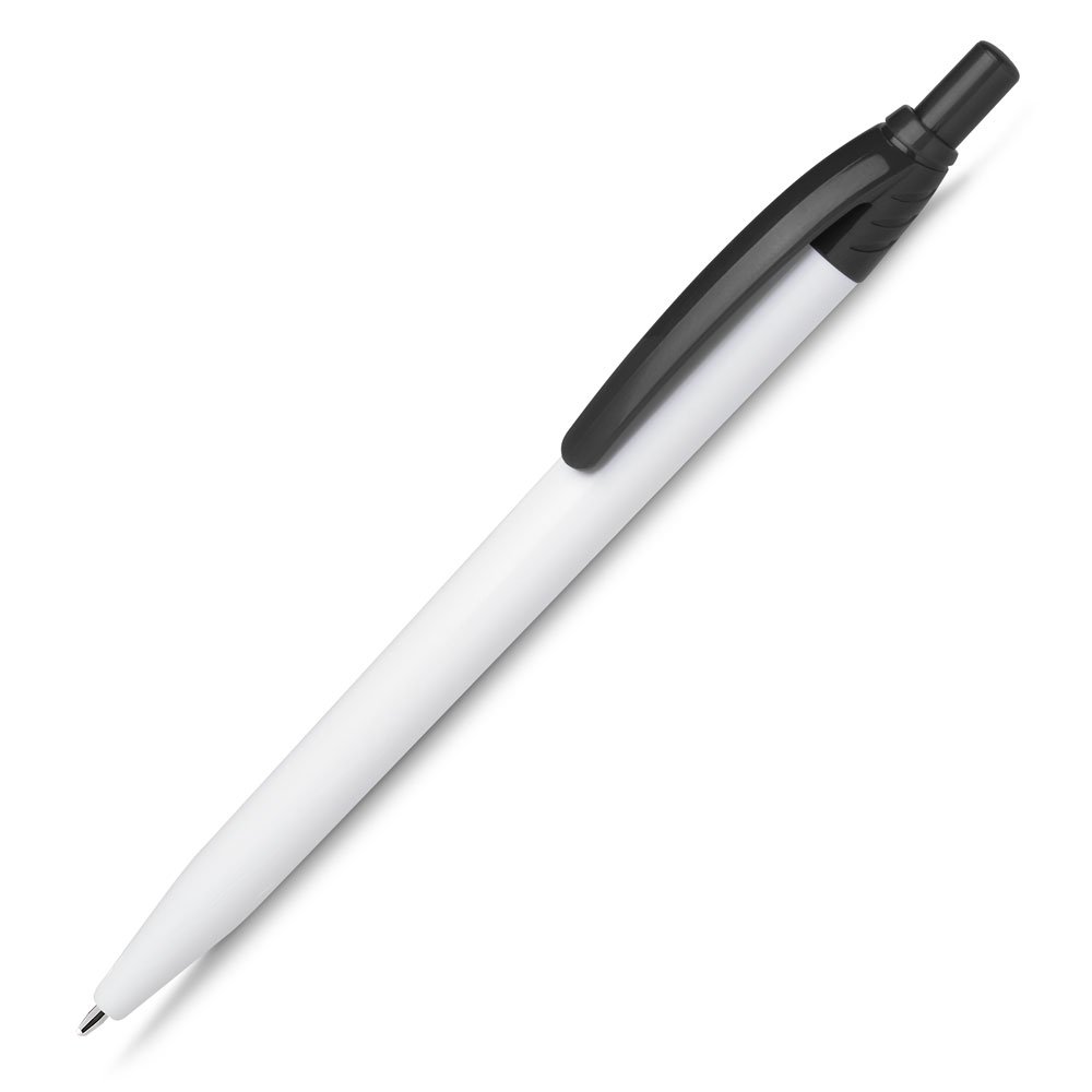 Caneta plástica com carga esferográfica azul 1.0mm e acionamento por clique.