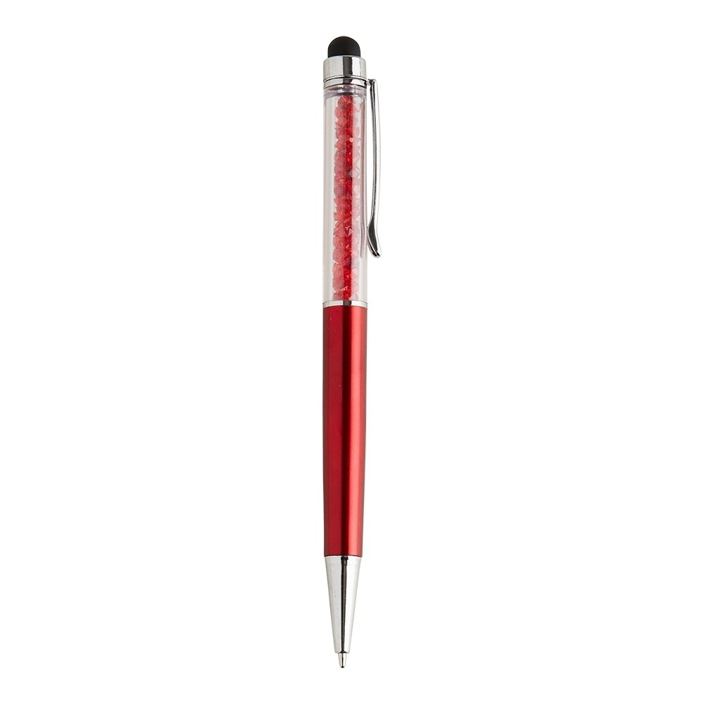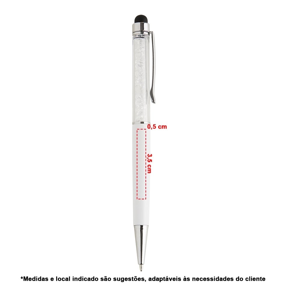 Caneta plástica com touch screen e detalhes em cristal, acionamento por rotação e carga esferográfica azul 1mm.