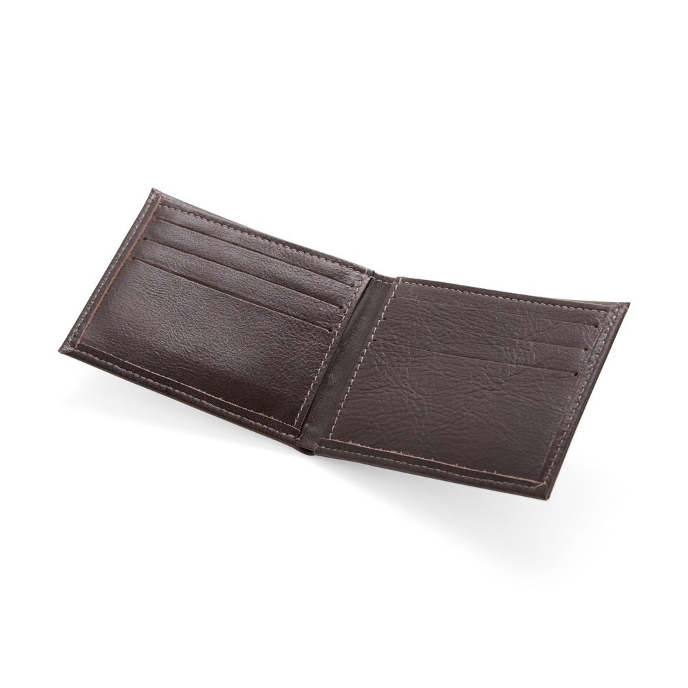 Carteira em couro com design compacto e sem fechamento. Possui seis divisórias internas para cartões e documentos e um compartimento para cédulas.