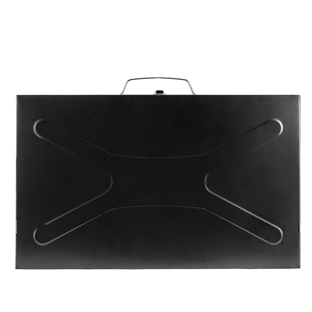 Churrasqueira feita em metal com funcionamento a carvão. Possui formato compacto e pode ser transportada como uma maleta quando desmontada, além de alça para transporte, trava de segurança para fechamento e quatro pés retráteis. Acompanha uma espátula e espeto duplo com cabo em madeira.