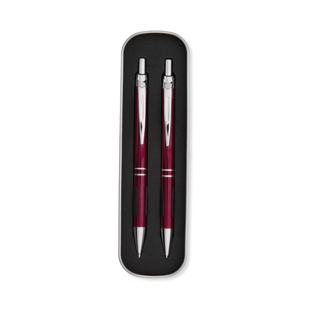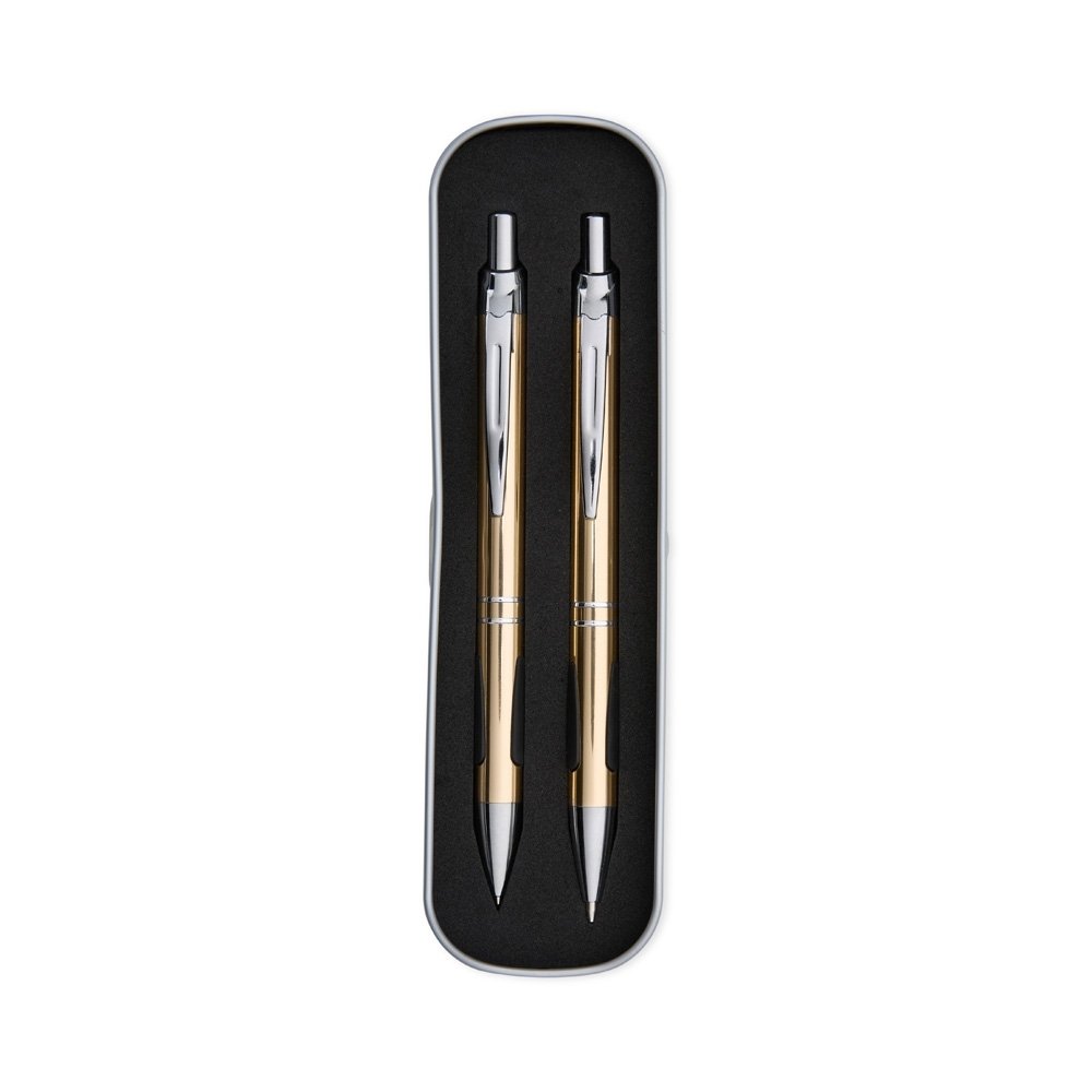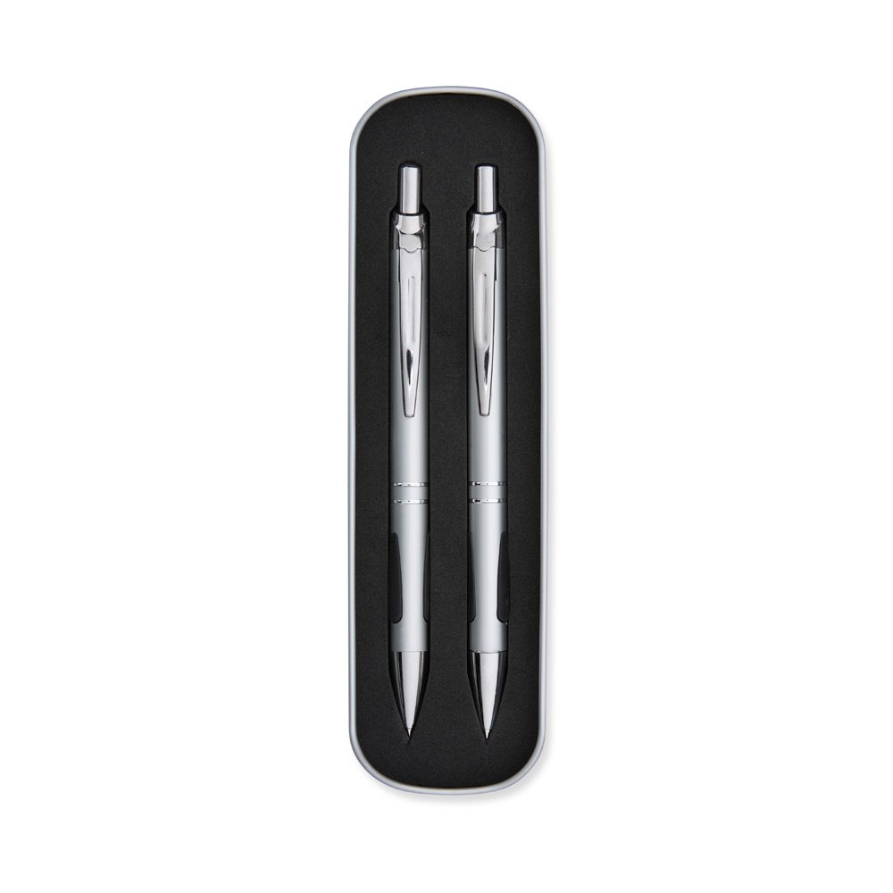 Conjunto de caneta e lapiseira metálicas em estojo de metal. Caneta e lapiseira possuem acabamento fosco, detalhe emborrachado na parte inferior, carga esferográfica azul de 1.0mm e acionamento por clique. Estojo revestido em espuma.