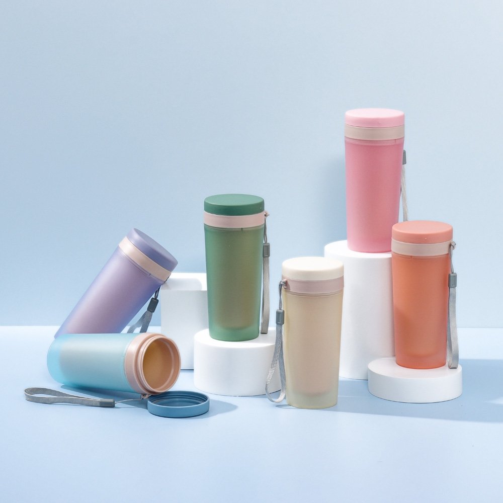 Copo isotérmico de plástico polipropileno com capacidade para 300ml livre BPA. Acompanha tampa rosqueável e alça de nylon para transporte.