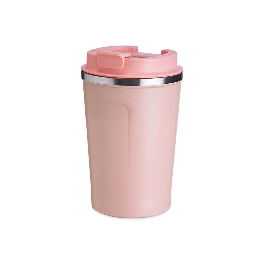 Copo térmico de inox 350ml com parede dupla, parte inferior com borracha antideslizante e tampa rosqueável com abertura de bocal.