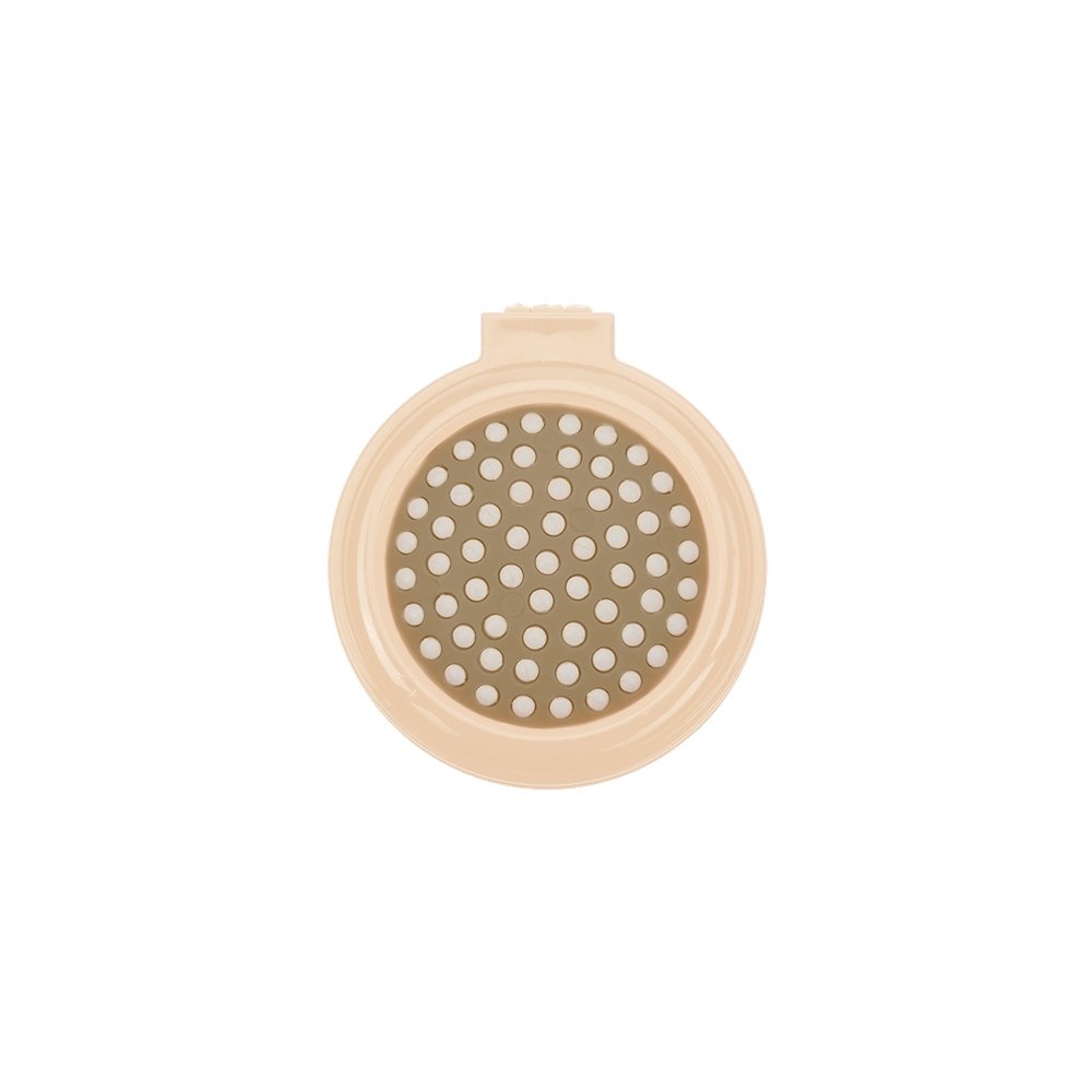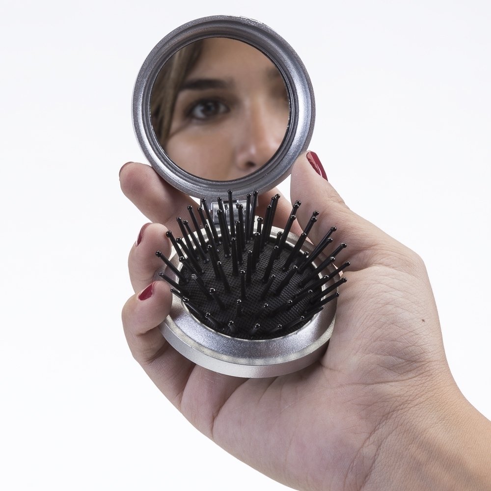 Escova com espelho redondo em plástico resistente. Parte superior plana e parte inferior emborrachada com relevo, estando aberta a peça basta empurrar a parte emborrachada (lado de fora) para poder usar a escova.