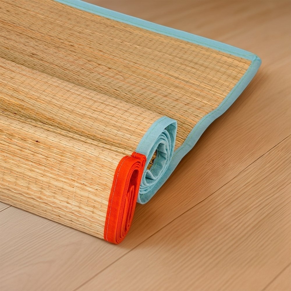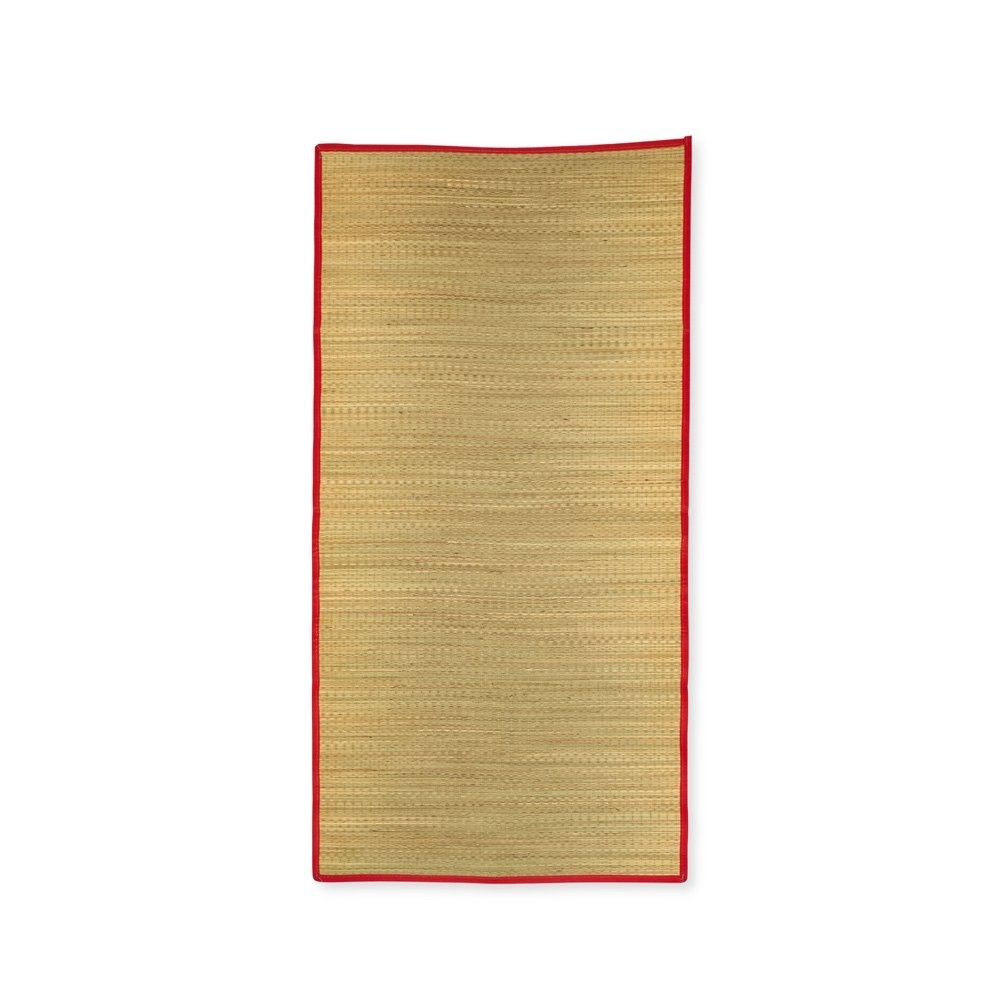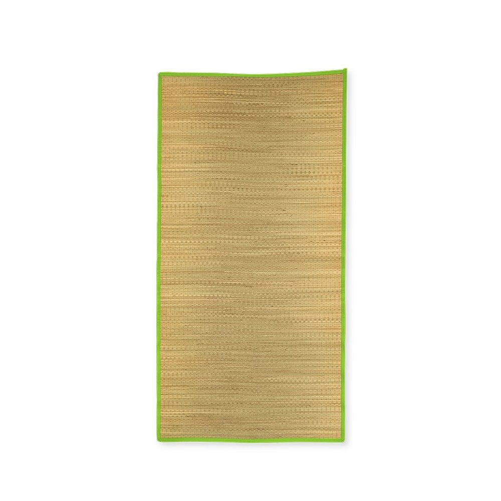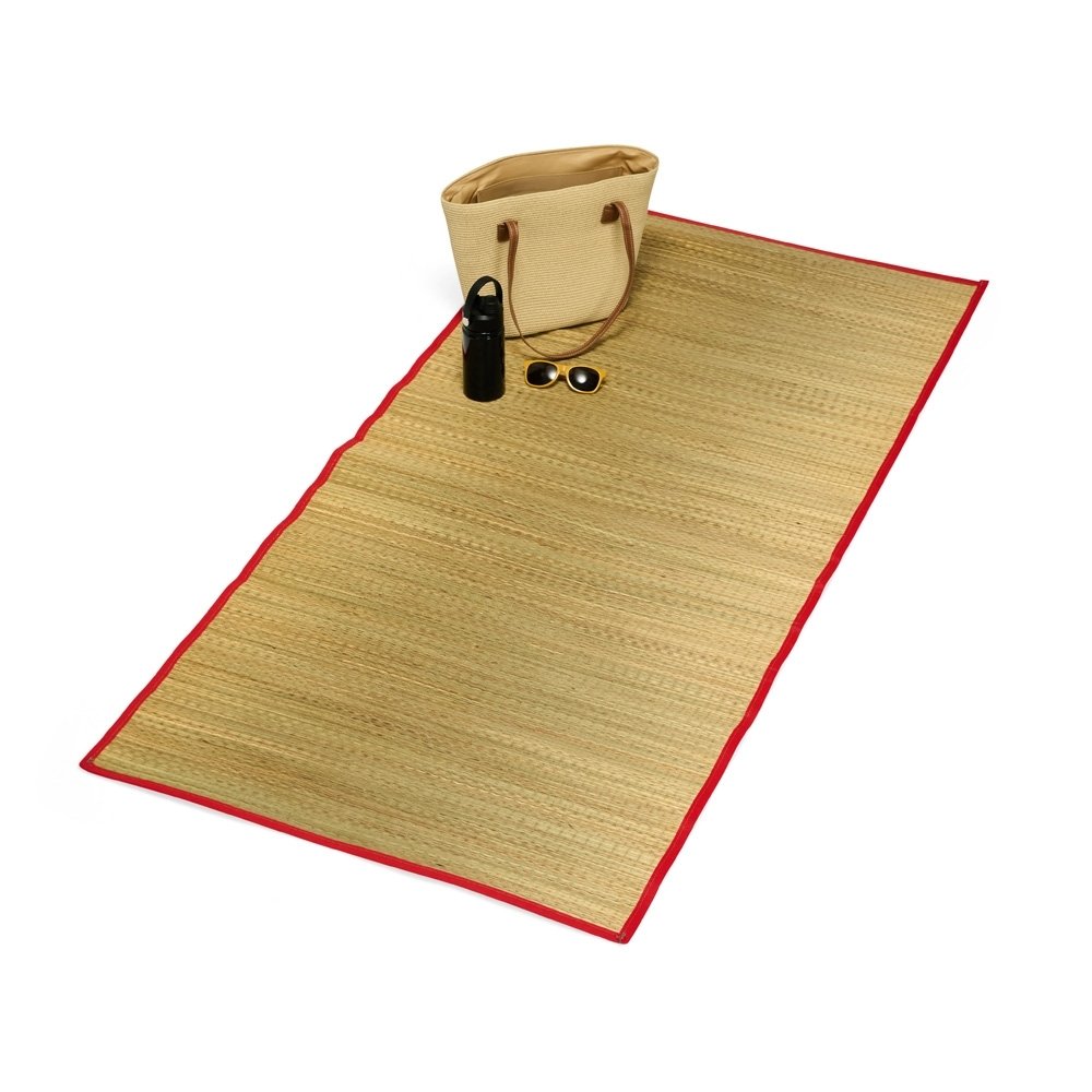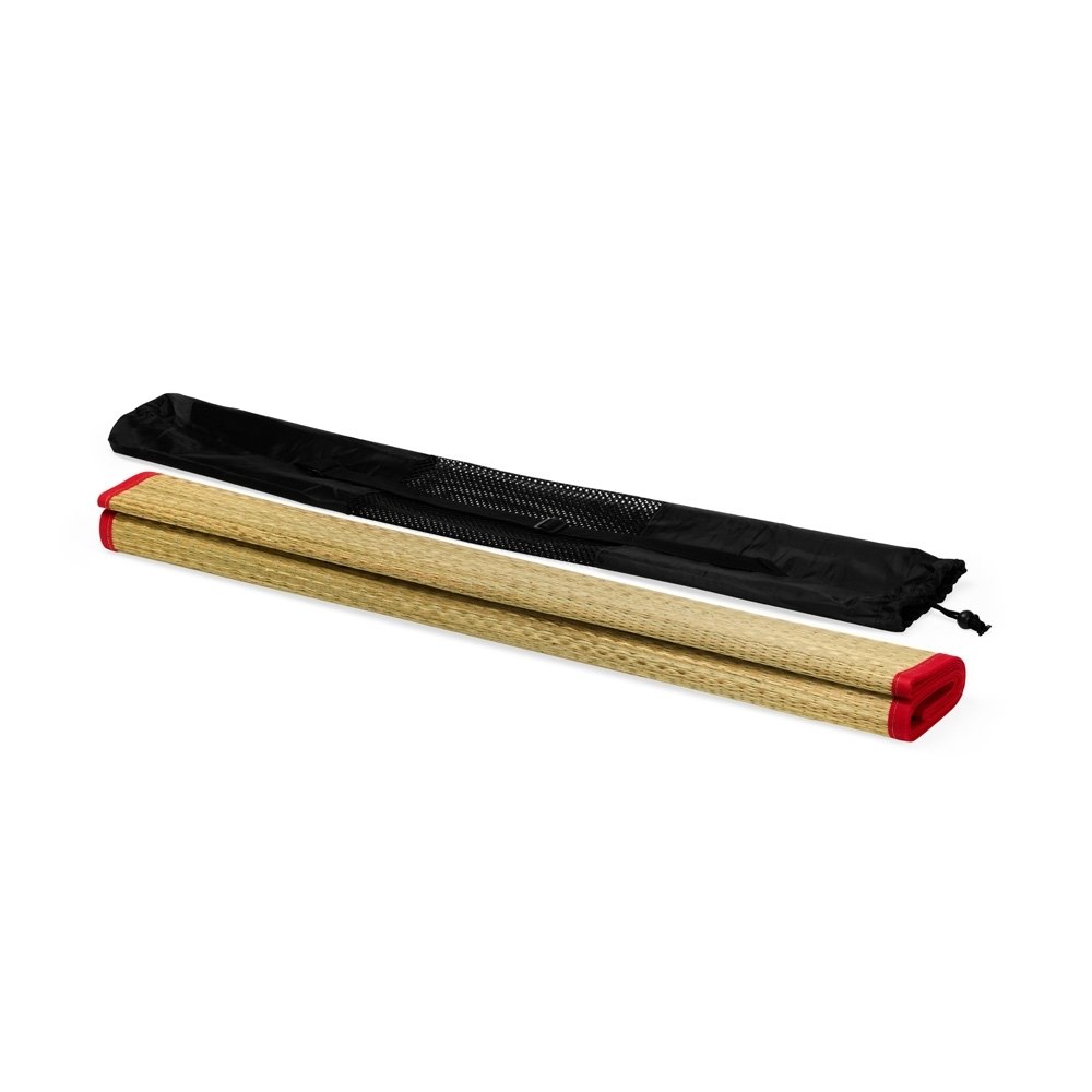 Esteira leve feita em palha natural com bordas costuradas em nylon. Acompanha saco de nylon com seção telada, cordão de fechamento e alça regulável para transporte.