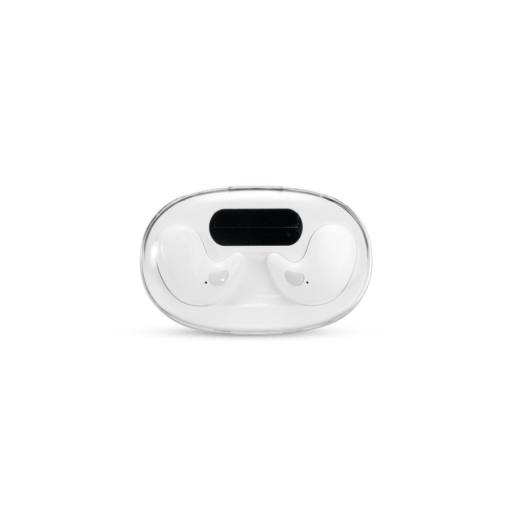 Fones de ouvido intra-auriculares sem fio, com estrutura leve e compacta em plástico e conexão via Bluetooth 5.3, garantindo estabilidade durante o uso. Possui estojo de carregamento com display de LED para visualizar o nível de carga. Acompanha cabo USB-C.