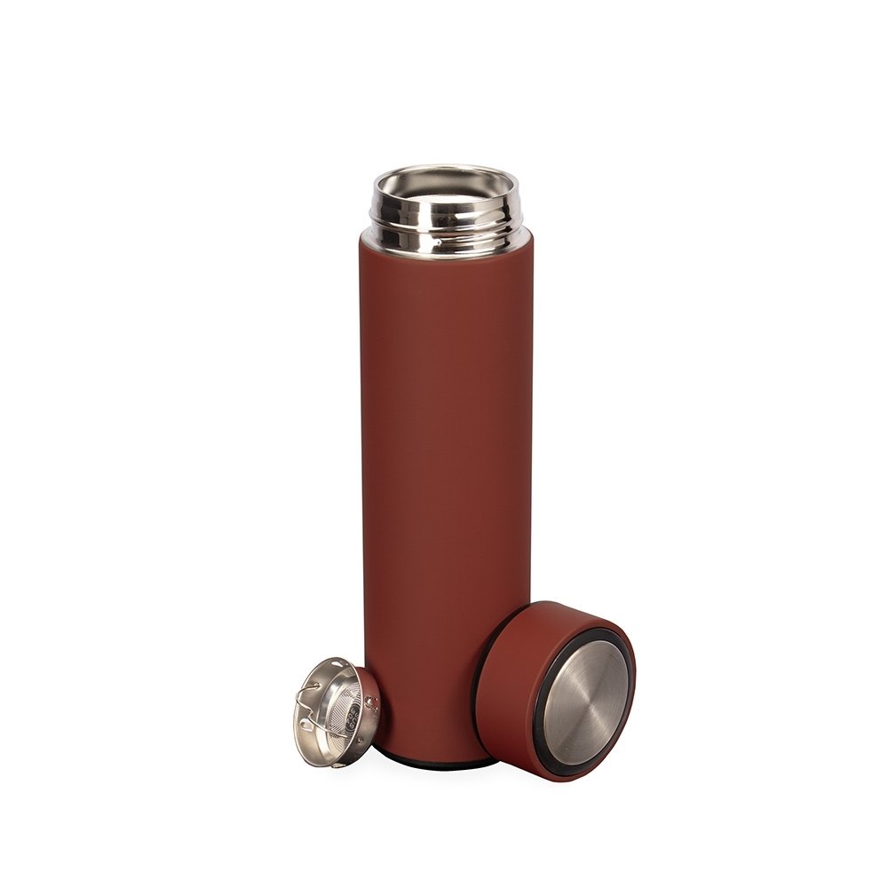 Garrafa térmica em inox com capacidade de até 500ml. Conta com tampa rosqueável e revestimento externo emborrachado que facilita a pegada. Possui parede dupla e isolamento a vácuo, o que permite conservar a temperatura de líquidos por mais tempo. Acompanha infusor em inox.