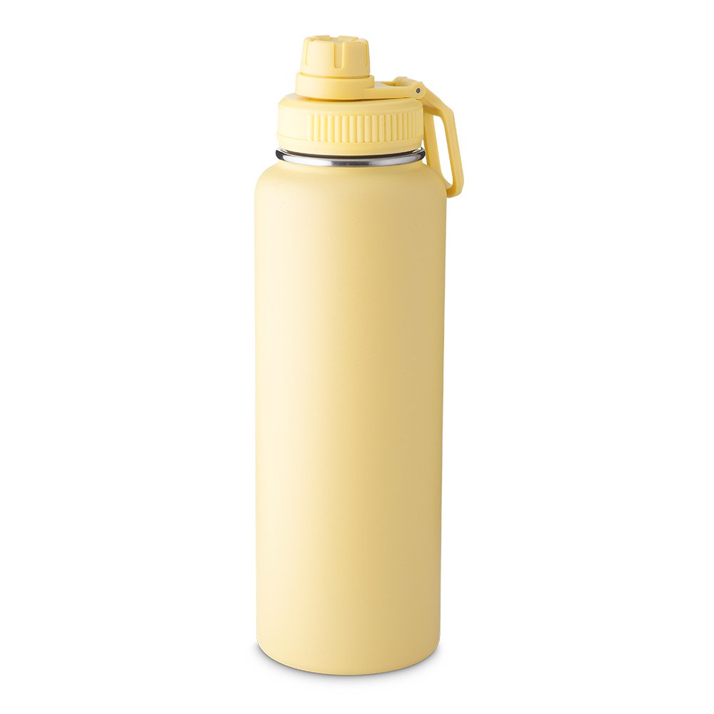 Garrafa térmica em aço inox com parede dupla isolada a vácuo e com capacidade de 1,2l. Alça plástica para transporte em formato de mosquetão, bico rosqueável para fácil acesso e tampa rosqueável com anel de silicone. Conta com uma pintura a pó.
