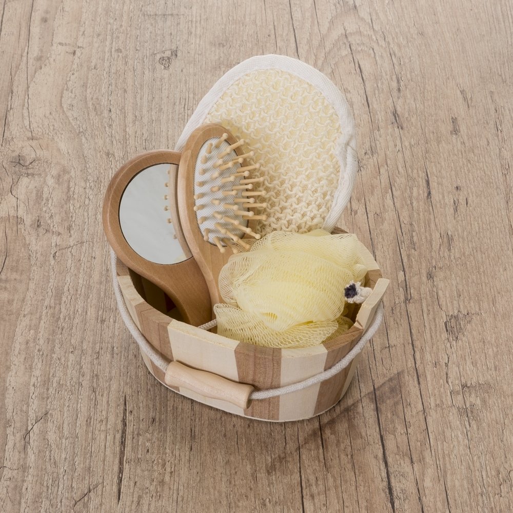 Kit banho de madeira com 5 peças. Possui: espelho, escova de cabelo, esponja de banho, bucha de banho e massageador. Acompanha balde com alça e pegador de madeira. OBS.: PEDIDO MÍNIMO 10 PEÇAS!