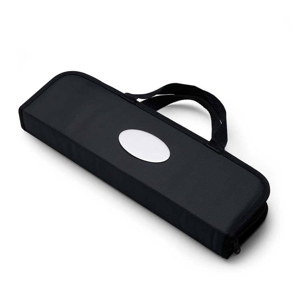 Kit Churrasco 17 Peças em estojo de nylon com alça. Contém: pegador, garfo, espátula, faca, pincel, 4 espetos e 8 garfos pequenos para petiscos. Utensílios de inox com proteções plásticas e parte interna com velcro para fixação das peças, acompanha plaquinha metálica para personalização.