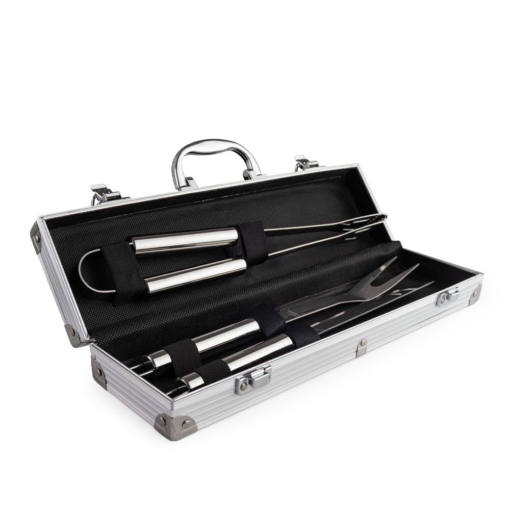 Kit de churrasco com três peças em aço inox. O conjunto inclui uma pinça, um garfo e uma faca de seis polegadas. Acompanha maleta de alumínio com placa para personalização.