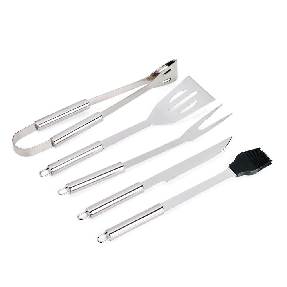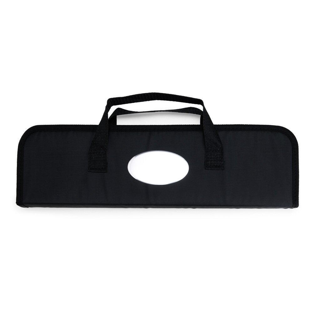Kit churrasco com cinco peças em inox. O conjunto inclui: uma faca de 6 polegadas, um garfo, uma espátula, um pincel com cerdas de silicone e um pegador. Acompanha estojo em nylon com um par de alças para transporte e placa metálica personalizável com verso autoadesivo para fixação.